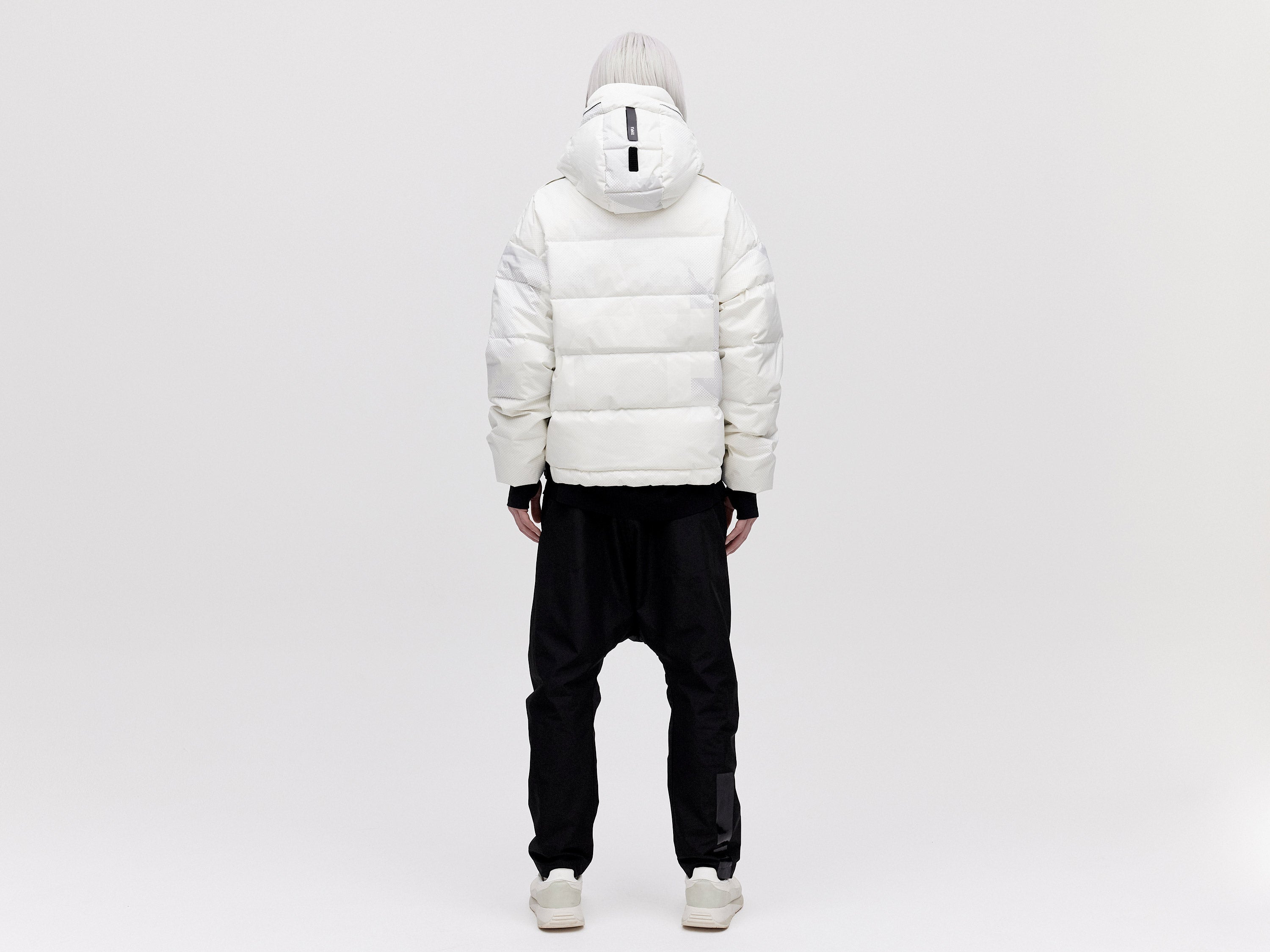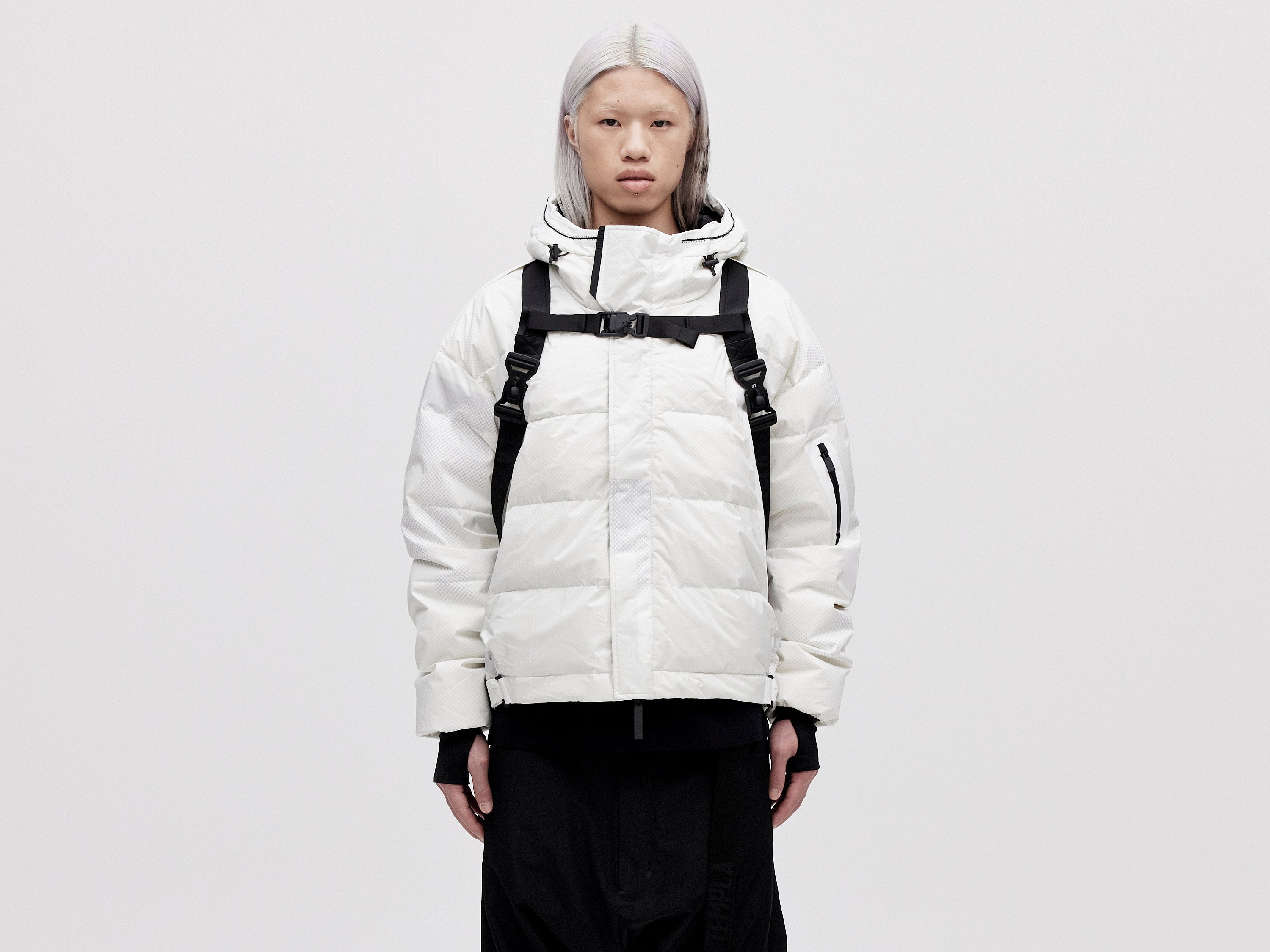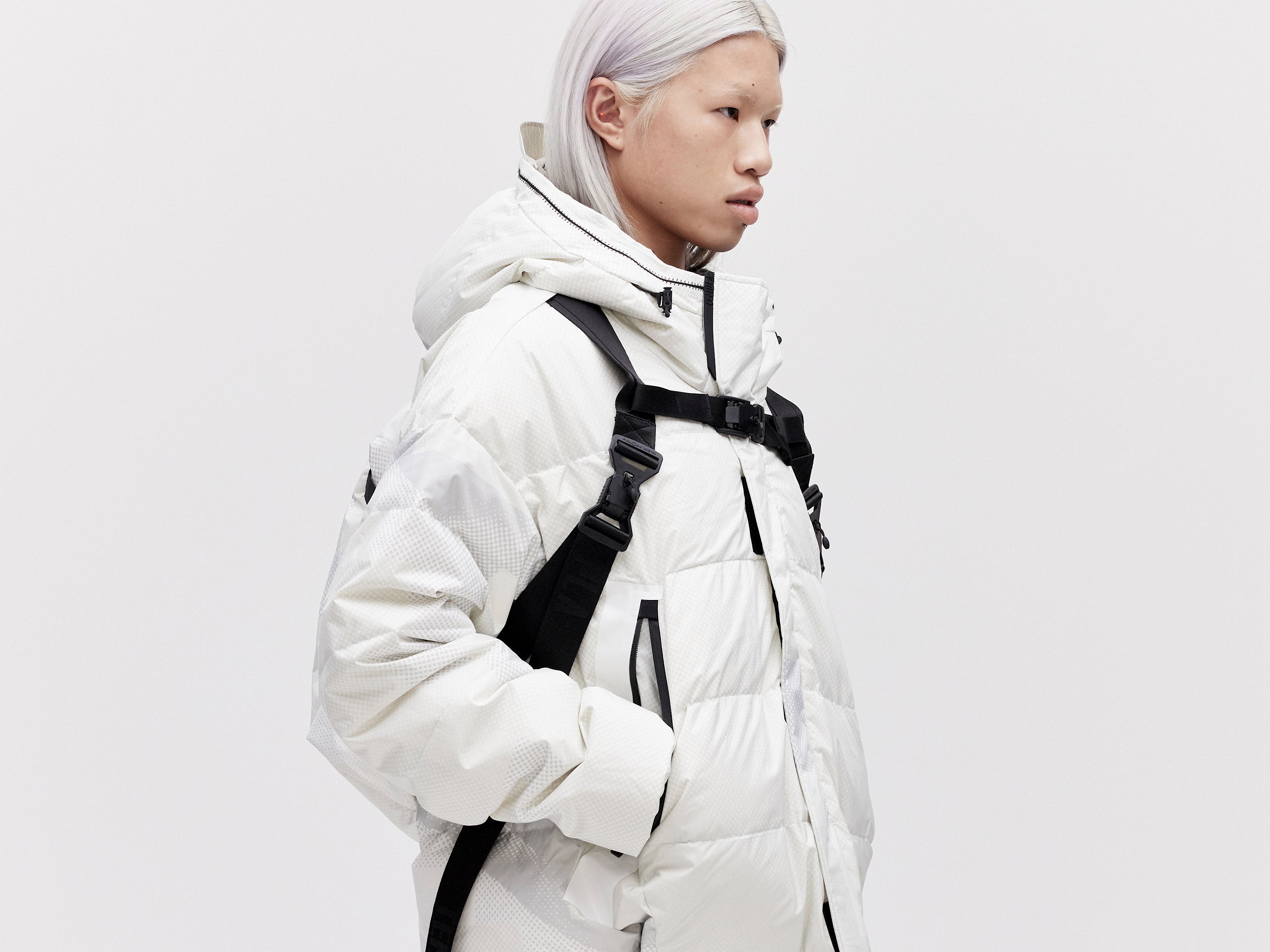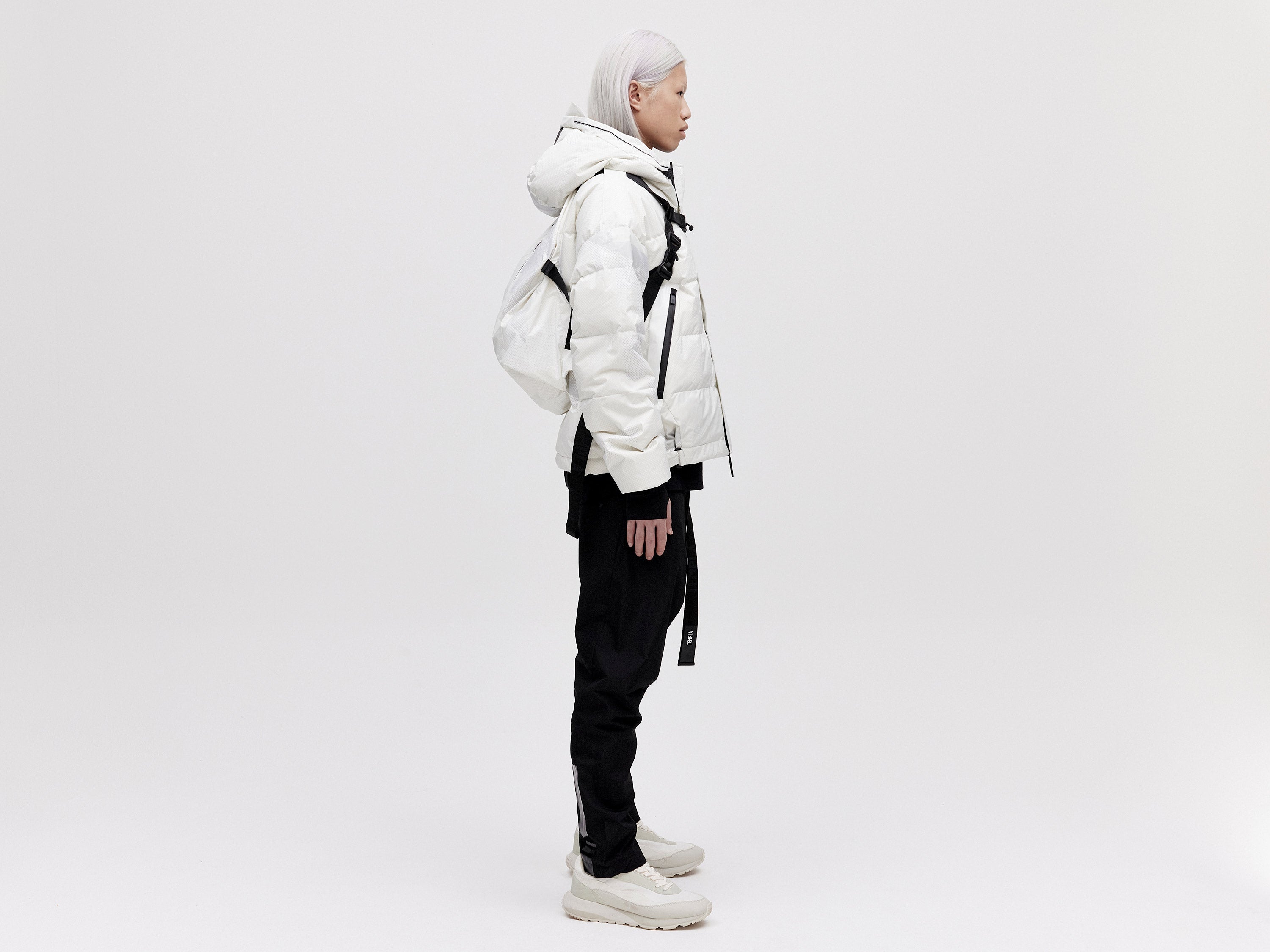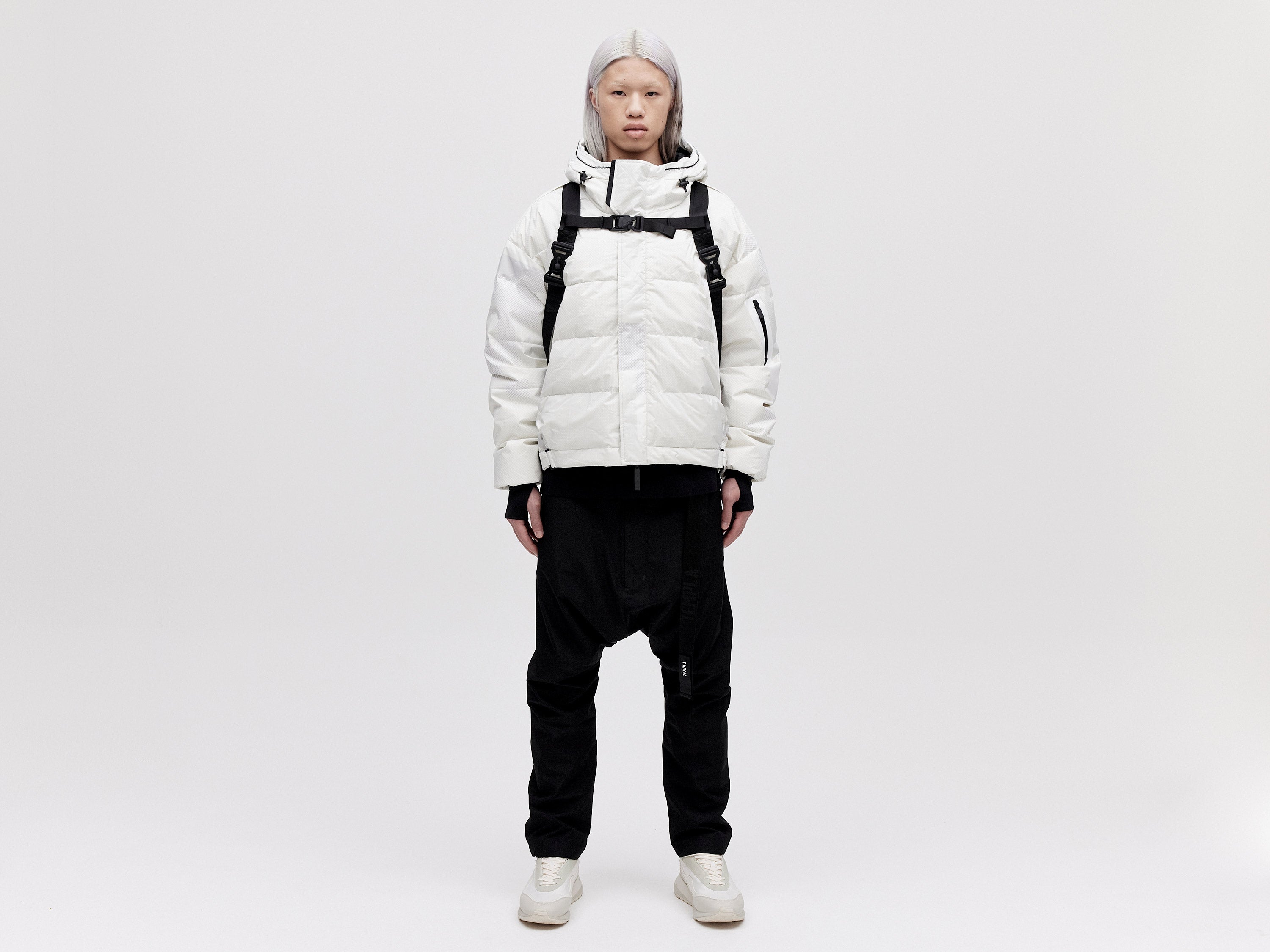 Our Utility Down Jacket is built to withstand the harsh cold winters. A matching waterproof backpack interfaces with the jacket via a channelled epaulette and comprises rapid access magnetic Fidlock clasps for easy on/off functionality. The jacket also features an adjustable hood and hem to lock in warmth and is made from a lightweight recycled waterproof shell that is padded with premium white goose down for optimum insulation.