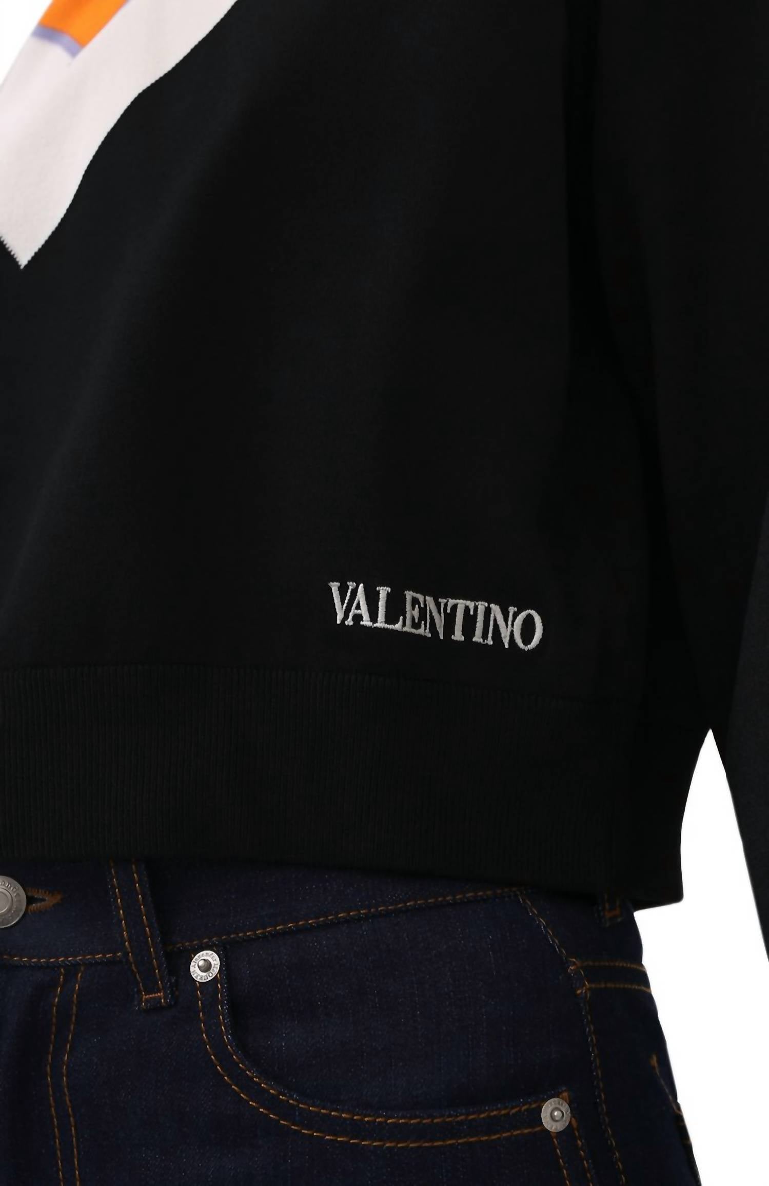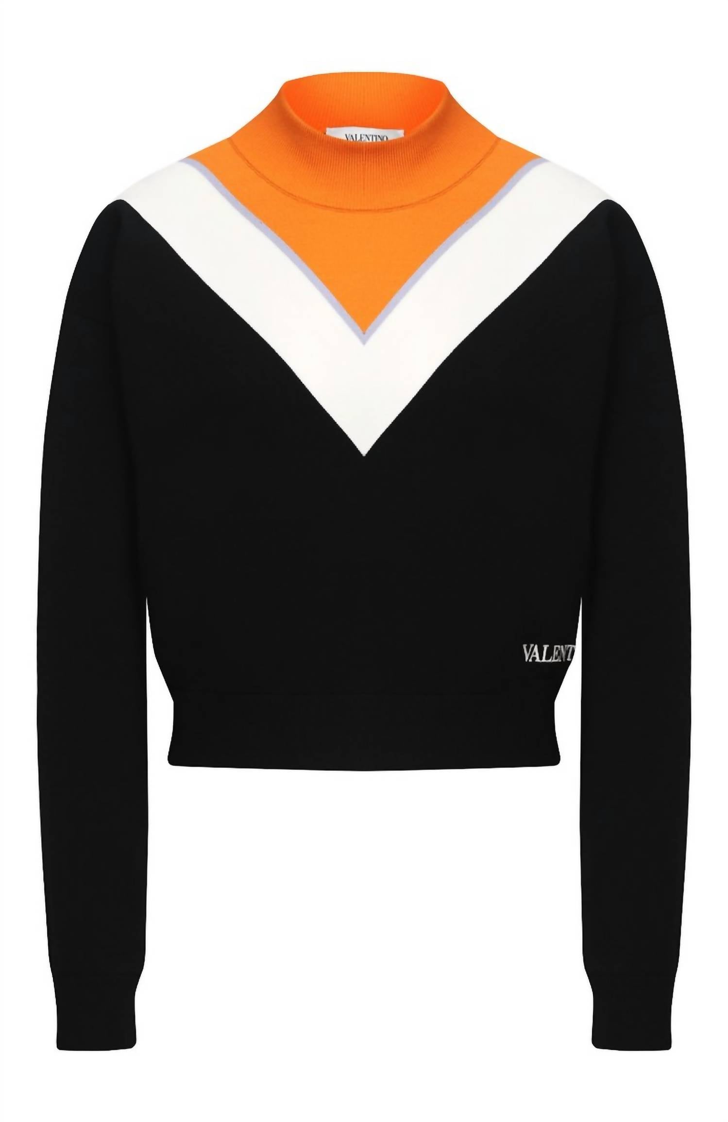 Fit to perfection and effortlessly chic. Experience the elegance of the Colorblock Viscose Pullover Sweater by Valentino, featuring long sleeves and a chic mockneck design. Expertly crafted in Italy from a viscose blend, this black sweater showcases a striking color block technique and a contrasting striped "V" neckline, paying homage to Valentino Garavani. The pull-on closure ensures ease and comfort, complemented by an embroidered brand logo at the bottom. Care instructions suggest hand washing to maintain this exquisite piece.