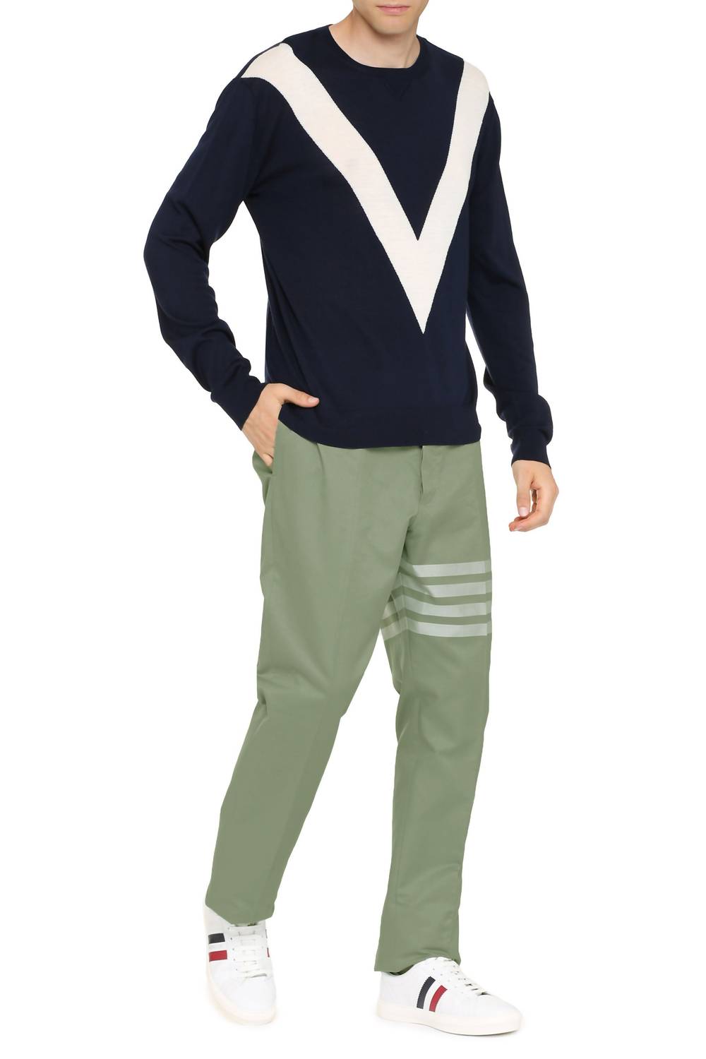 Introducing the Crewneck Wool Sweater by Valentino, a stylish piece perfect for winter. Featuring long sleeves and a classic crewneck, this sweater is crafted from 100% virgin wool with a ribbed neckline, cuffs, and hem for added detail. Originating from Italy with a pull-on closure, it showcases a graphic pattern in white and navy. For best care, dry clean only, and model measurements are 95 chest, 185 height, 93 hips, and 78 waist.