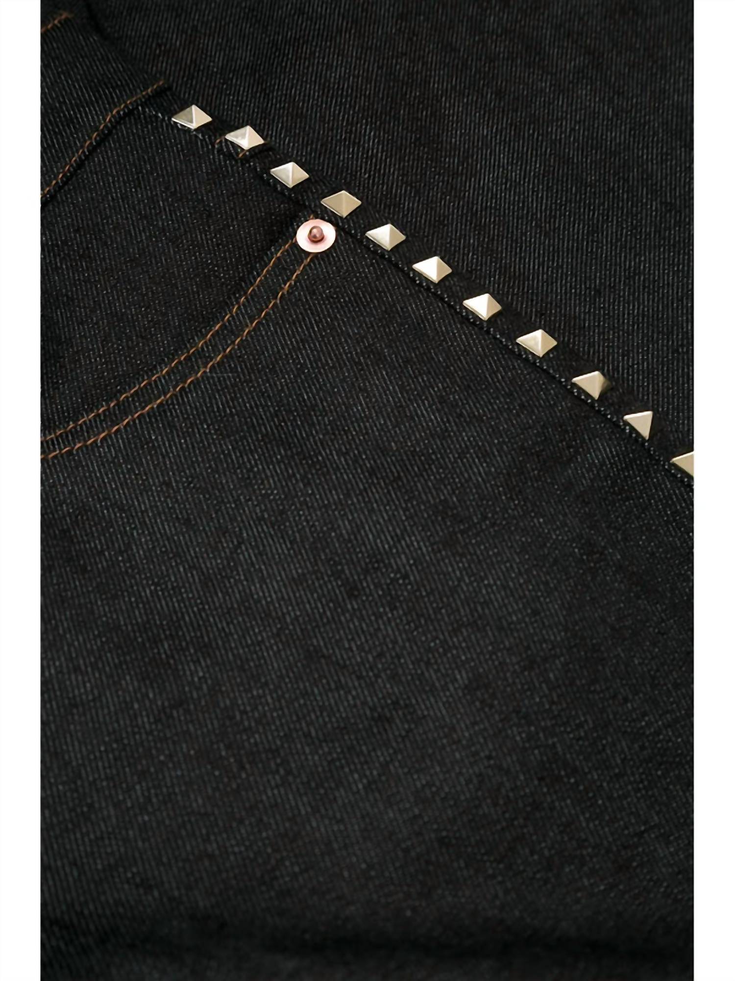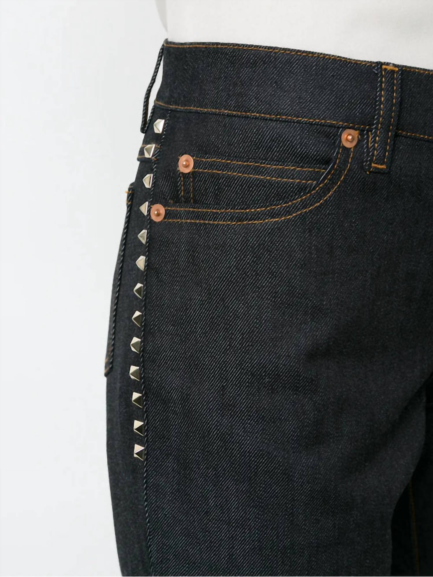 Embrace iconic style with the Women's Rockstud 5 Pockets Denim Jean by Valentino Garavani. These straight-leg jeans in navy blue feature signature gold-tone Rockstud detailing along the side, providing a striking contrast. Crafted from denim with a mid-rise waist and ankle-length cut, they offer both comfort and elegance. Closure: Front button and zip fastening with classic five-pocket styling, made for any occasion. Imported quality with an unmistakable look.