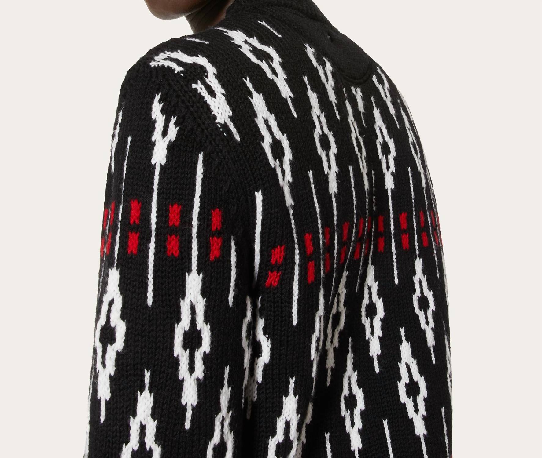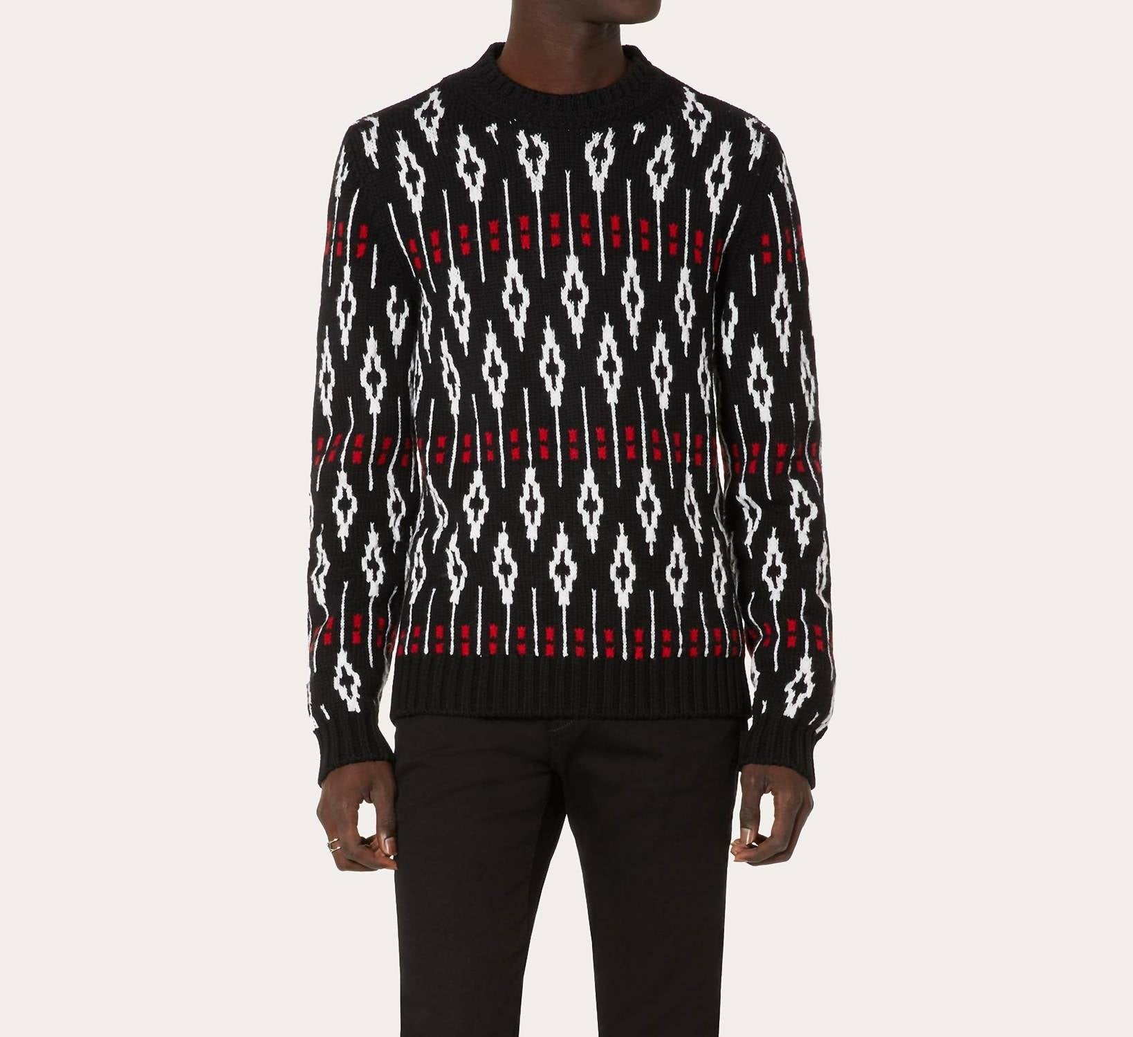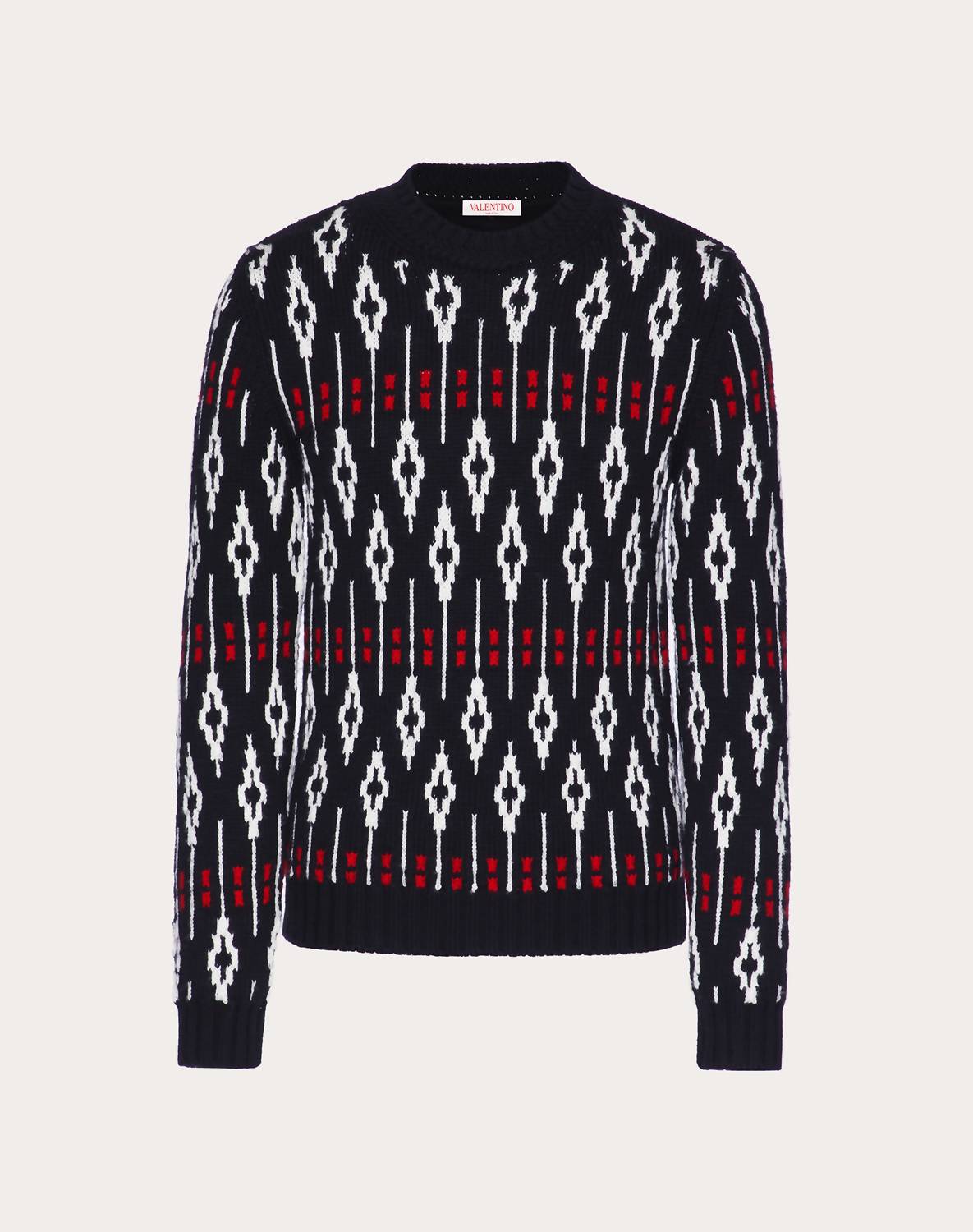 Embrace elegant style with the Valentino Geometric Pattern Crew Neck Sweater, an exquisite piece crafted for men. This slim fit sweater features long sleeves and a striking geometric print with a studded back collar. Made from 100% wool and manufactured in Italy, it promises both quality and sophistication with a length of 68 cm for size M. Designed with a pull-on closure for ease, this sweater requires dry cleaning to ensure it maintains its luxurious appeal.