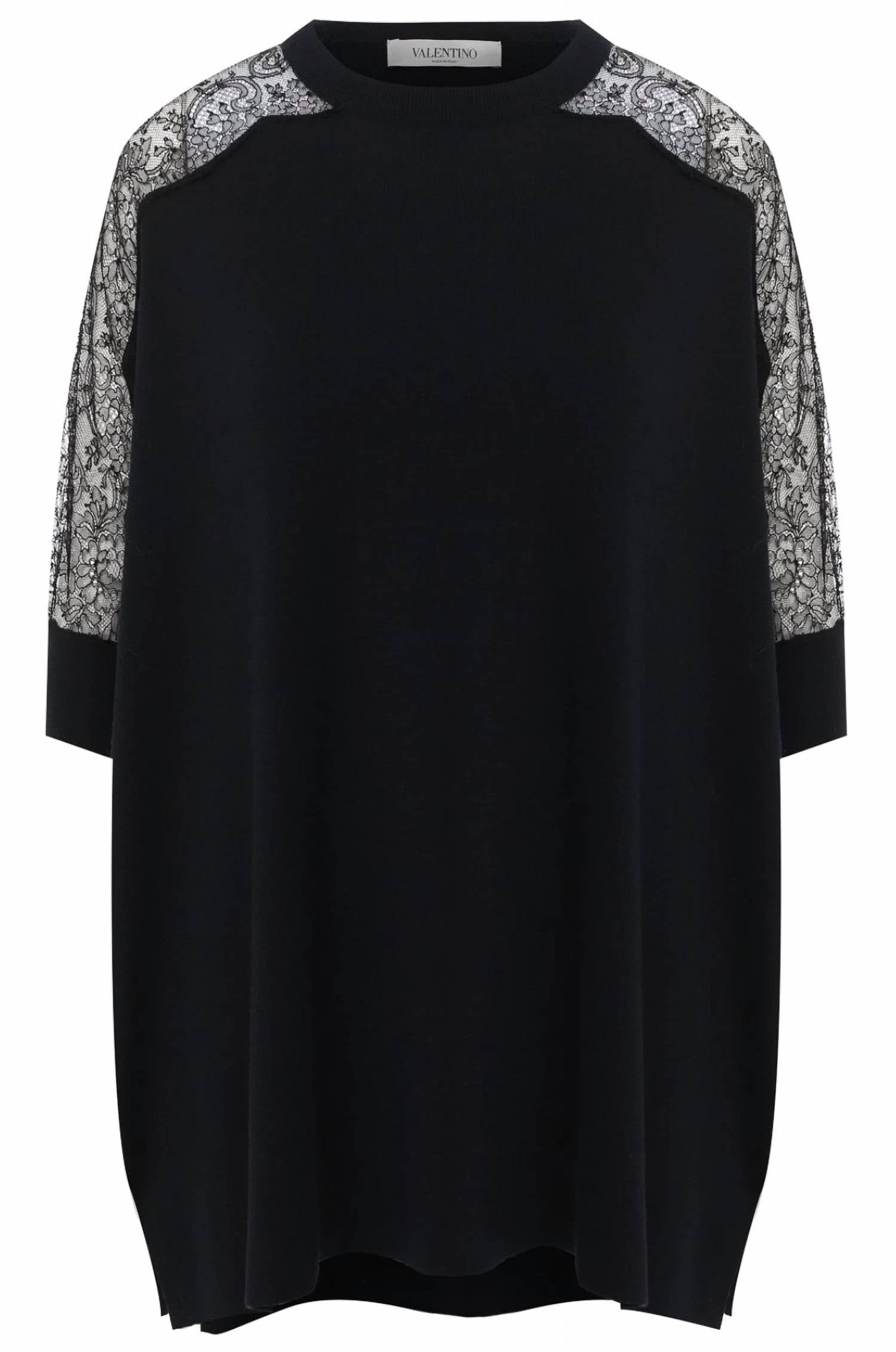 Stay warm and stylish in this versatile and effortlessly cool knitwear staple. Wear it alone or layered, it's the perfect sweater for the season and you'll wish you had it in every color. Introducing the Knit Light Jumper Sweater by Valentino, a sophisticated choice for any wardrobe. Crafted in Italy, this versatile black piece features short sleeves and a high-low hem with elegant lace panelling on the shoulders. Made from a premium blend of virgin wool, polyester, and viscose, it offers a luxurious feel and optimal comfort. Pull on. Hand wash to maintain its quality. Model is 5'10" with a 31.49" bust, 25.59" waist, and 36.22" hips.