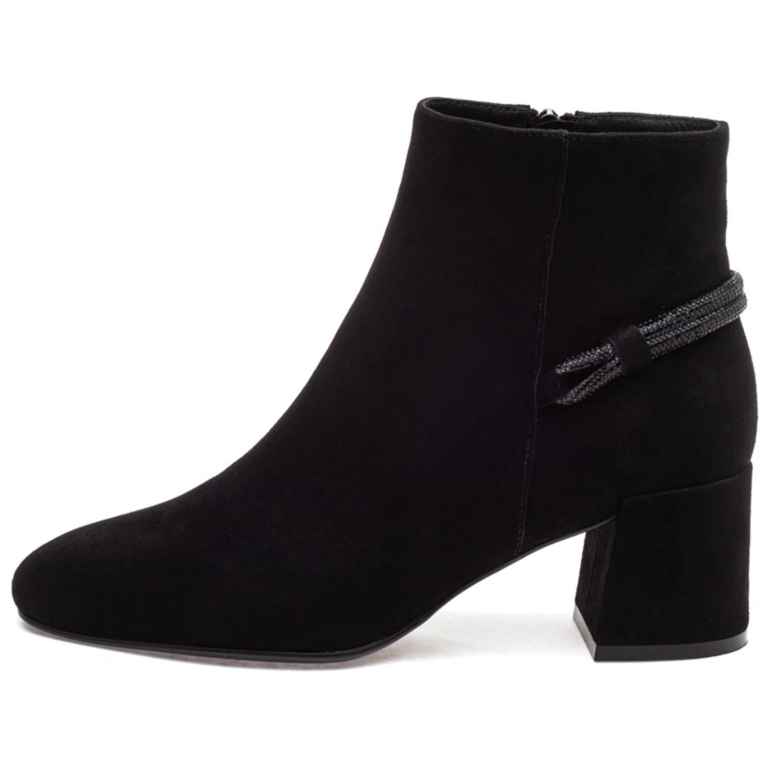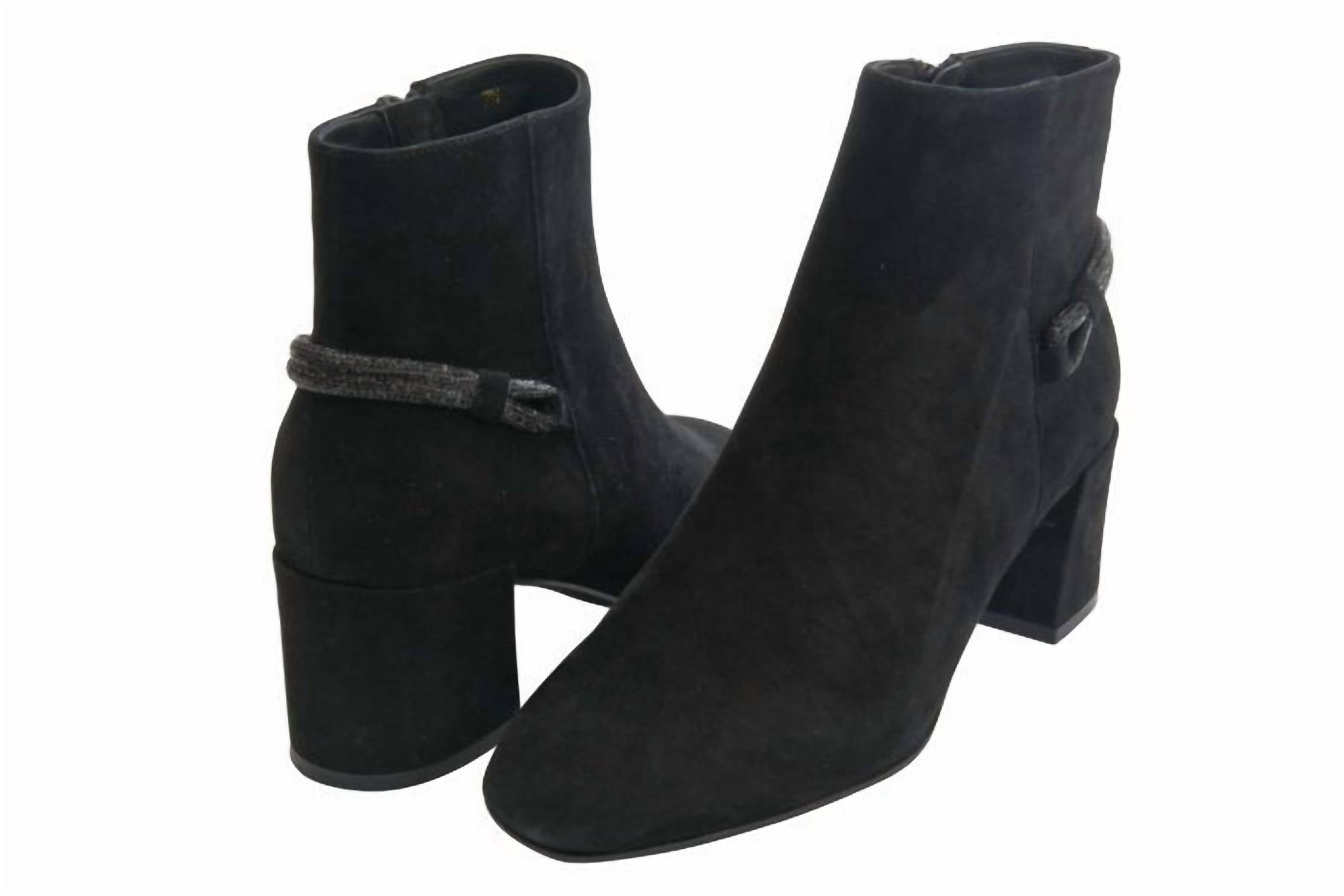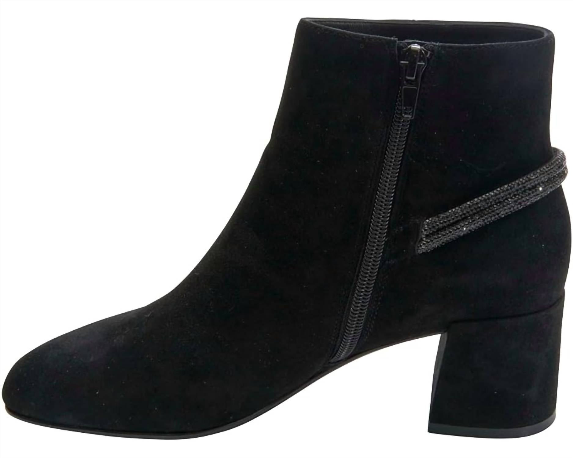 Say hello to the perfect, most versatile boot. The ankle height makes this style easily transition from day to night. Wear them with your favorite skinny jeans and tee for a more laid back look, or pair them with your favorite mini dress and jacket for a night out on the town. Step into elegance with the Women's Shermy Bootie by VANELi, crafted in sumptuous black suede for a luxurious look. This ankle boot features a diamanté corded heel strap, a convenient side zip closure, and a comfortable padded insole. The round toe design pairs perfectly with a 2.25-inch covered block heel for a sophisticated silhouette. Elevate any outfit while enjoying the refined touch of these chic booties.