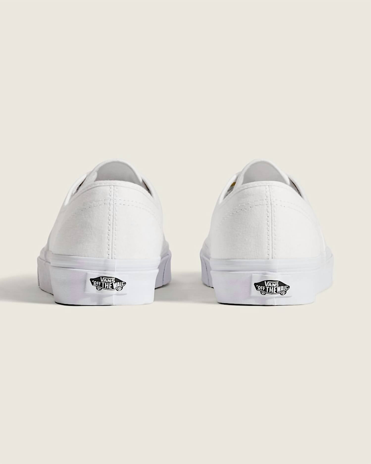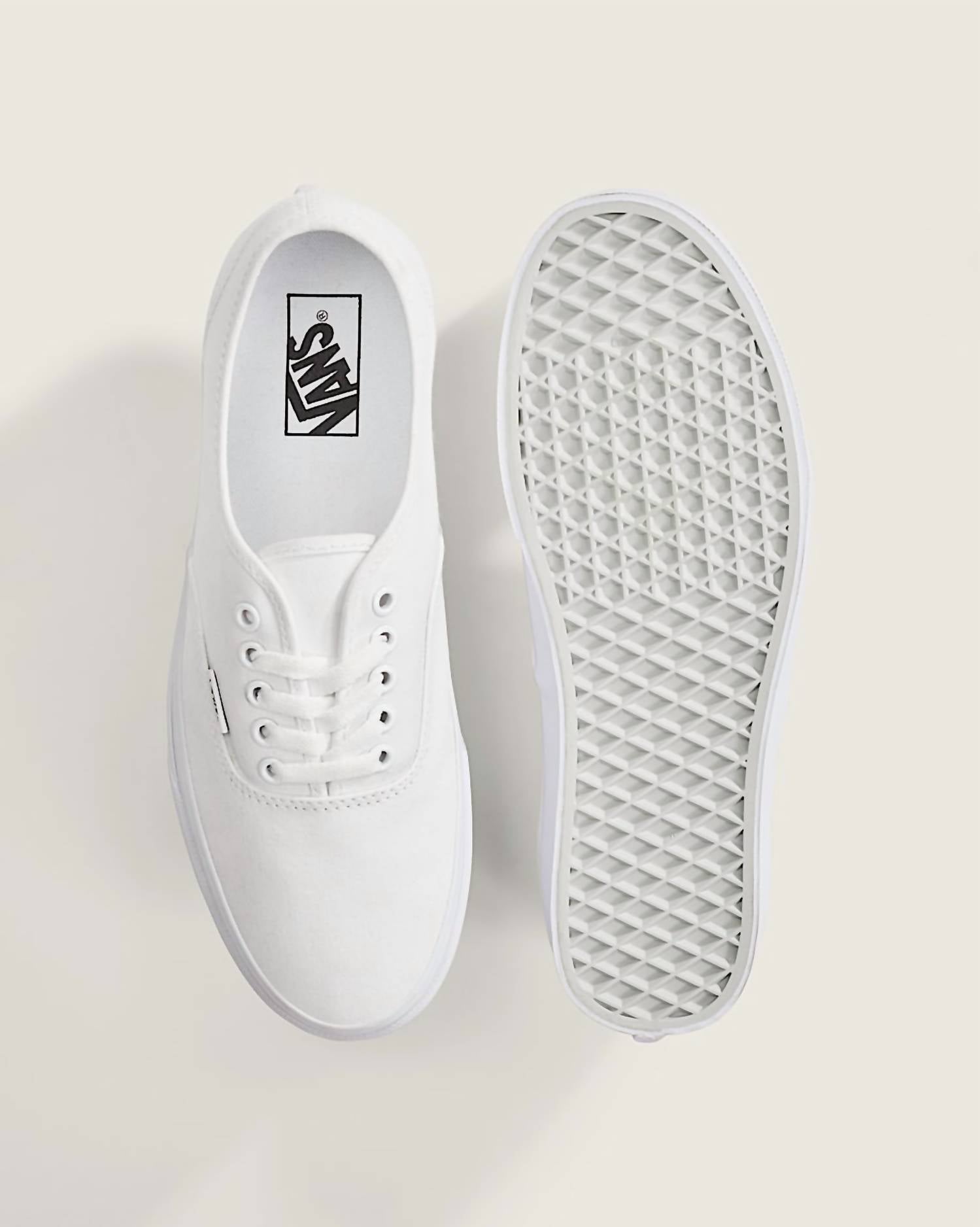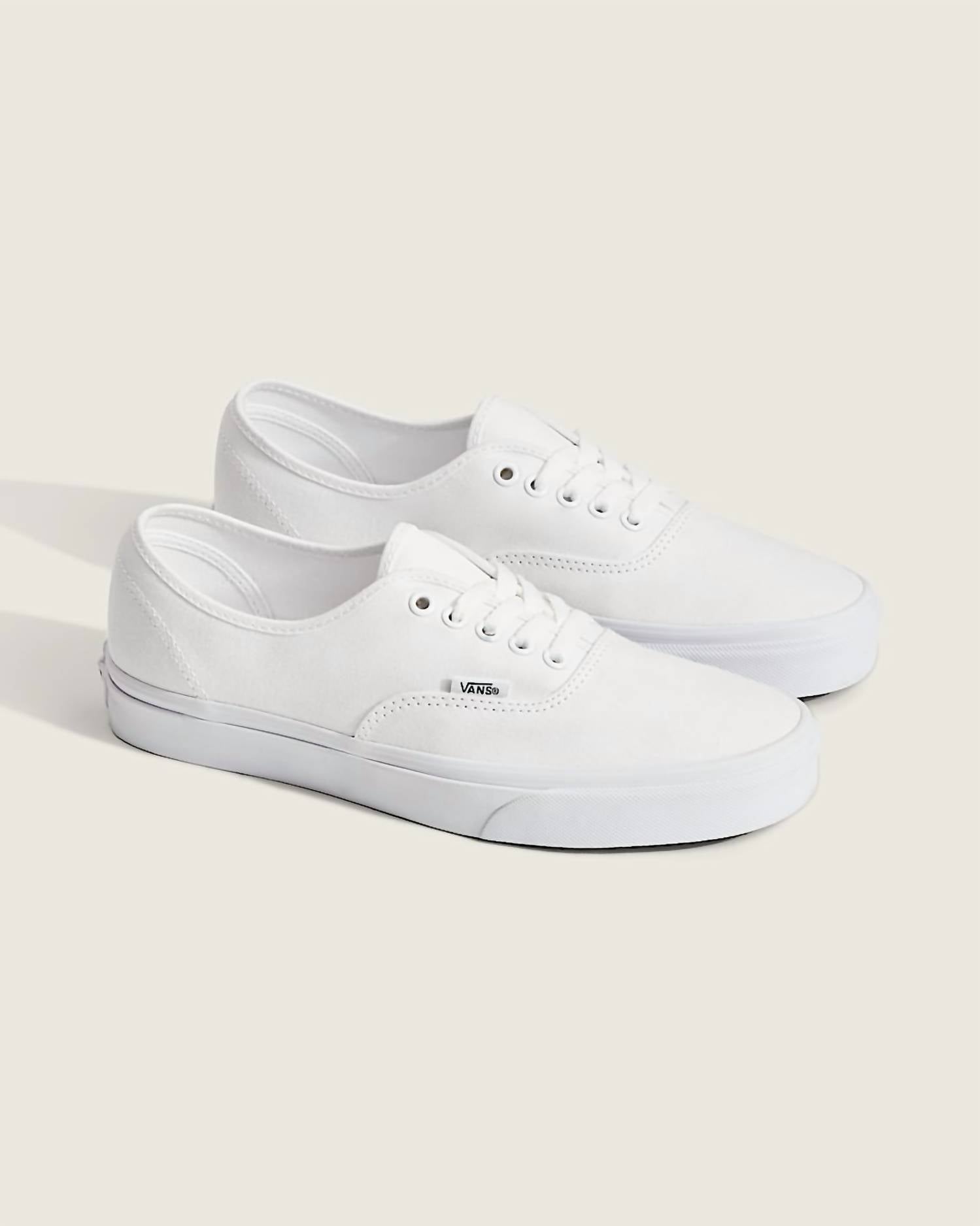 Get your daily steps in with these adorable sneakers. Step into a legacy of style with the Authentic Shoe by Vans in True White. This classic low-top sneaker features sturdy canvas uppers and a signature rubber waffle outsole, perfect for those who embrace a blend of tradition and creativity. Its lace-up closure offers flexibility, with 4 metal eyelet lace rows for sizes 3.5-6 and 5 metal eyelet lace rows for sizes 6.5 and up, ensuring a tailored fit. Designed for women, these sneakers carry the classic Vans heritage with a round toe shape and medium width.