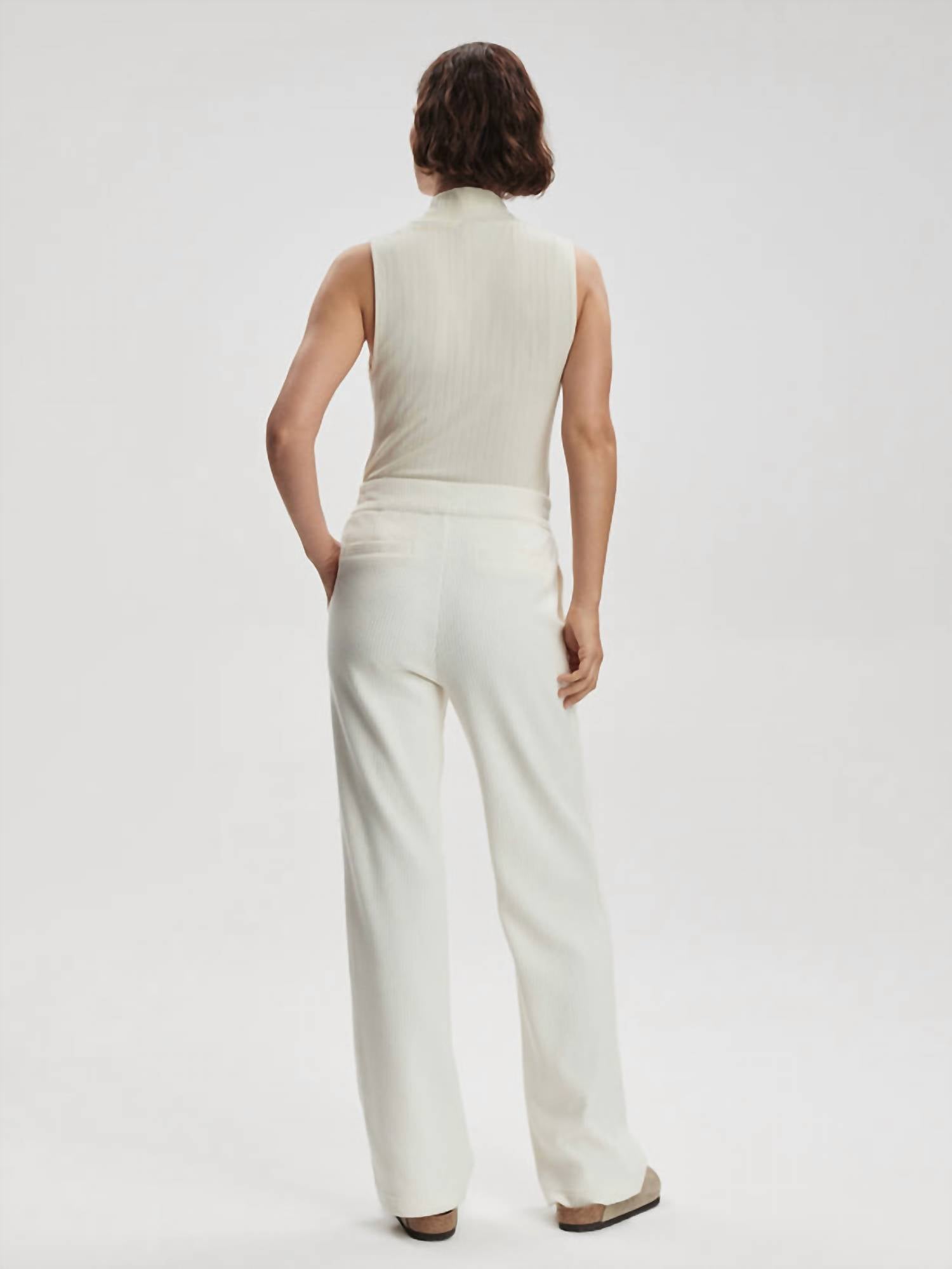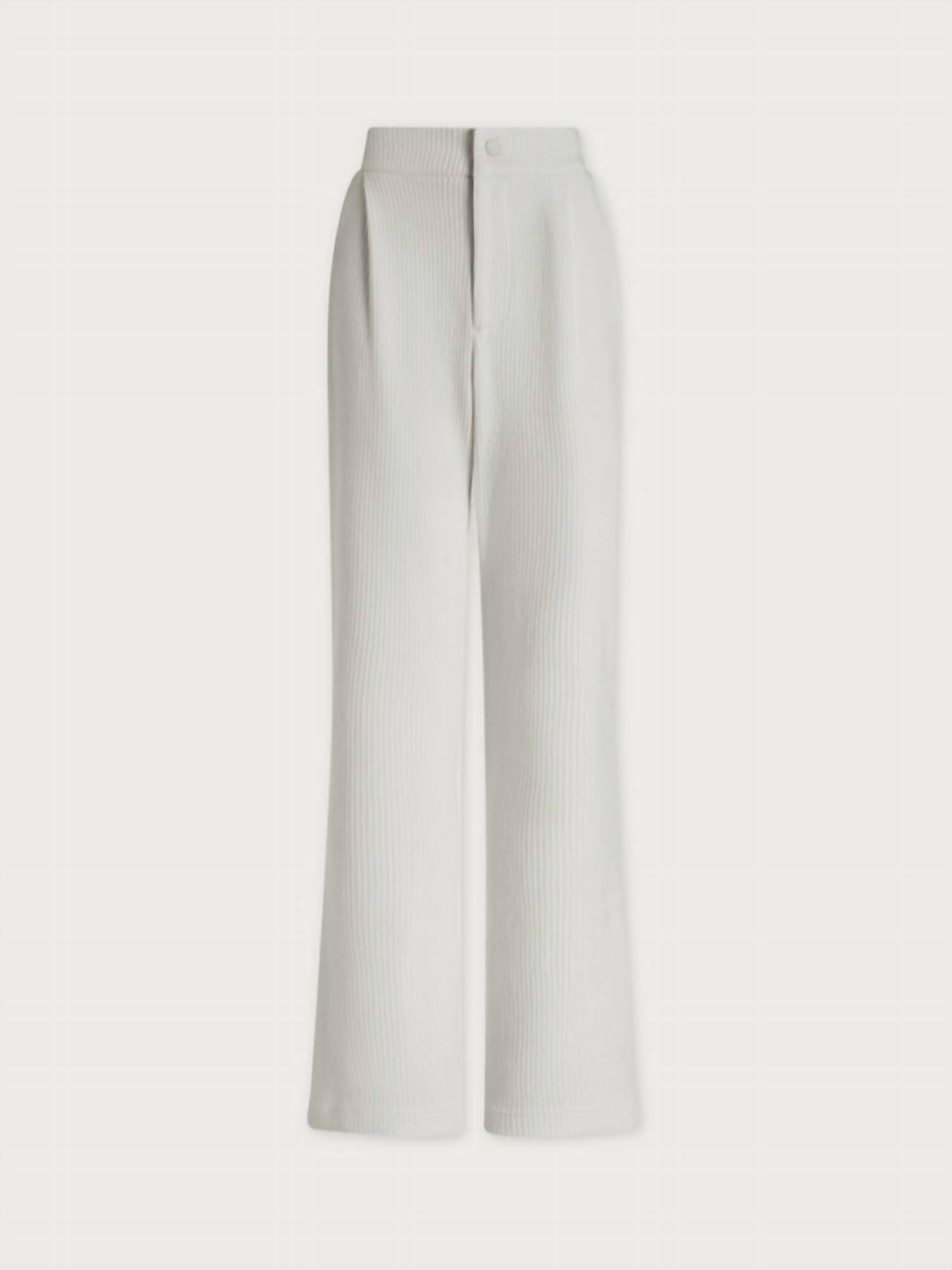 Introducing the Aberdeen Trousers by Varley, exemplifying an elevated approach to leisurewear in Soft Cord Jersey. Crafted in a pristine Egret color, these women's straight-leg trousers provide both comfort and sophistication. Designed with a solid pattern, pockets, and a secure hook and eye closure, they are perfect for spring holiday parties. Please follow the garment's care instructions as provided.