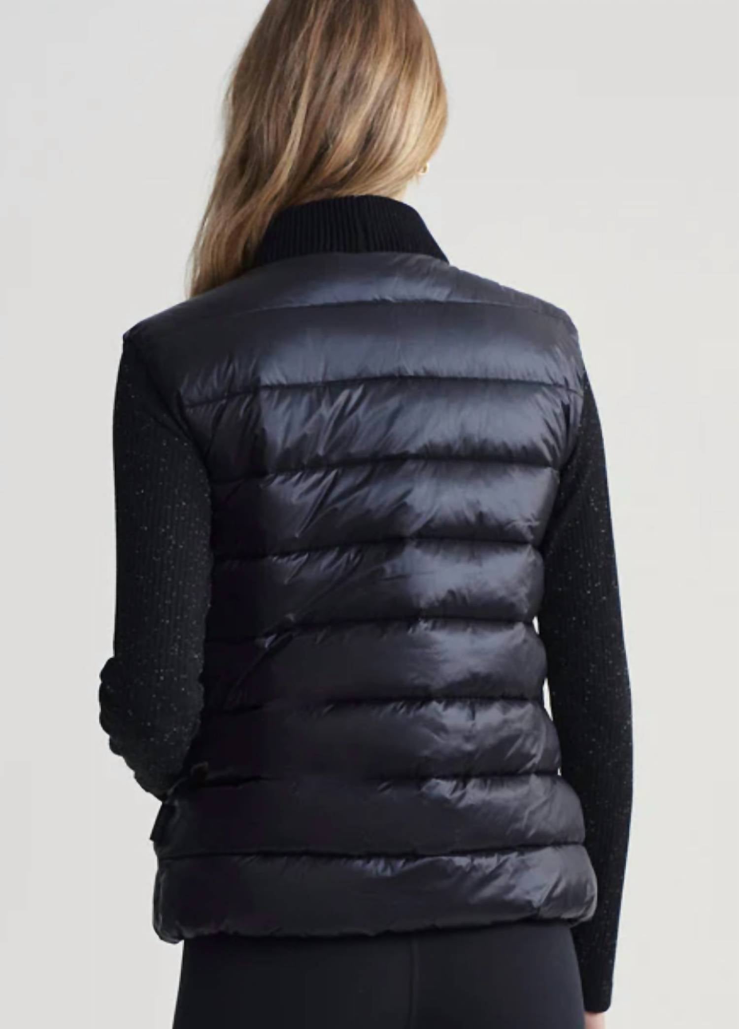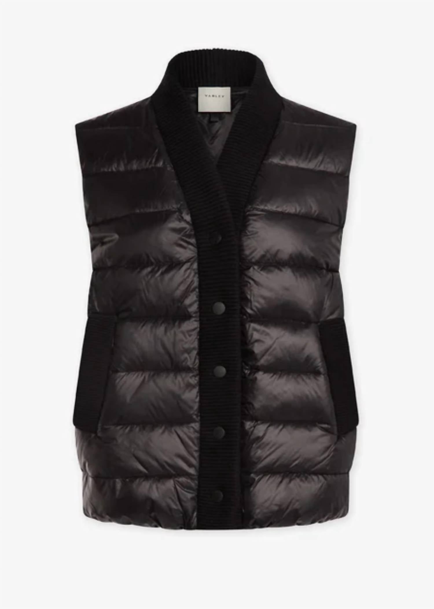 Throw this vest over an all black outfit for a perfectly polished look. Stylish blend of practicality and modern design in sleek black. Crafted from 100% lightweight quilted nylon. Sleeveless vest offers a relaxed fit. Snap closure ensures ease of wear. Knitted trims add a unique aesthetic touch. Your go-to for chic, functional layering.