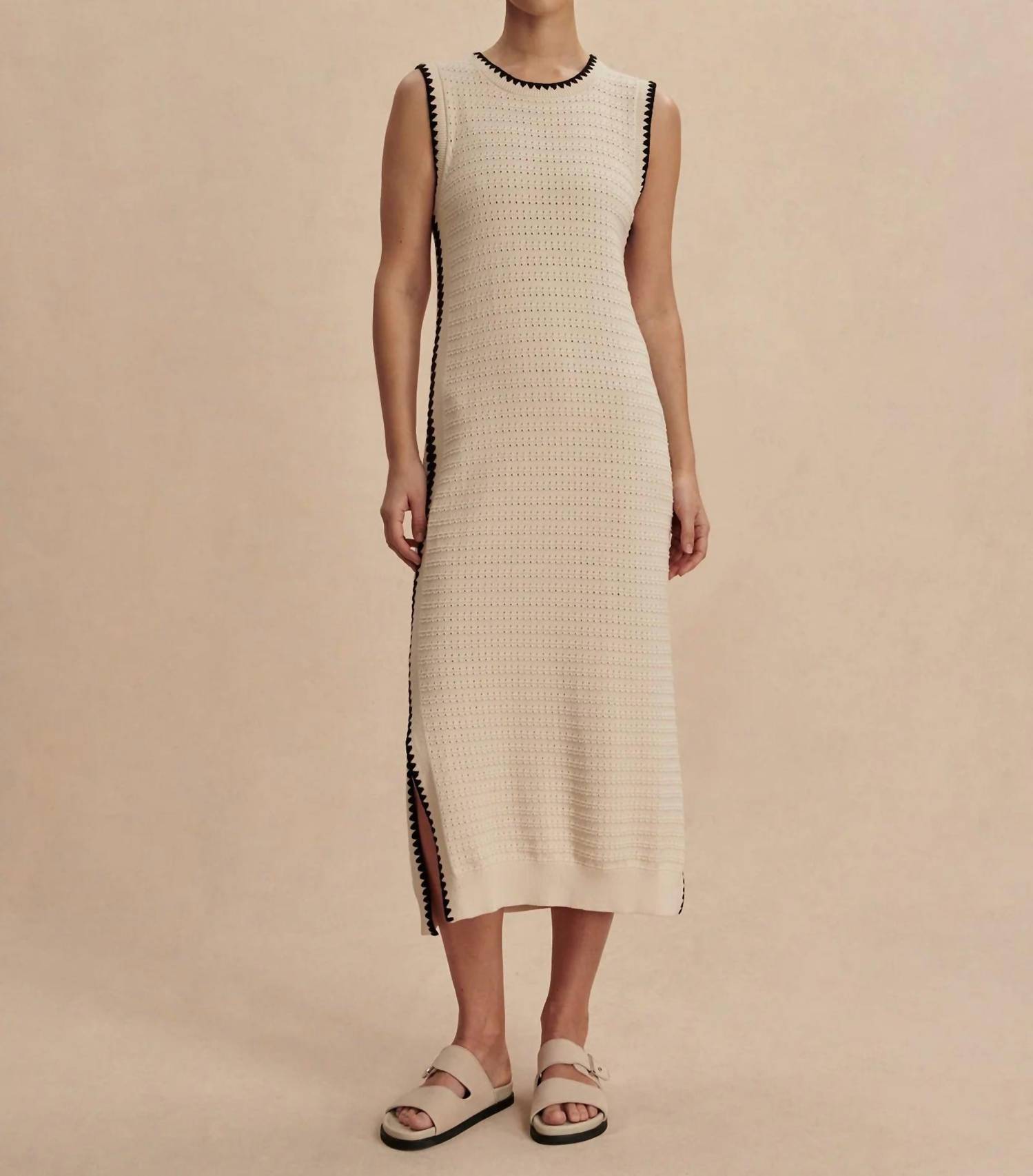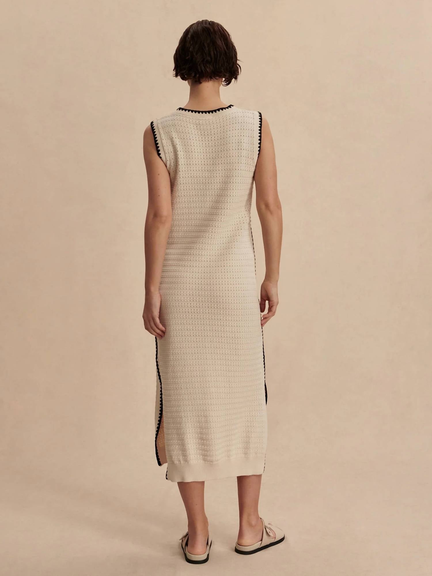 The perfect length dress does exist. The Dwight Tank Knit Dress by VARLEY is a summer essential for effortless vacation style. Designed in a sleeveless silhouette, this midi dress features a textured striped pointelle knit in a chic birch hue, complemented by side splits and contrasting scalloped edging. It's the perfect piece for versatile styling, whether paired with sandals for beach days or accessorized for evenings out. Model is wearing a size small.