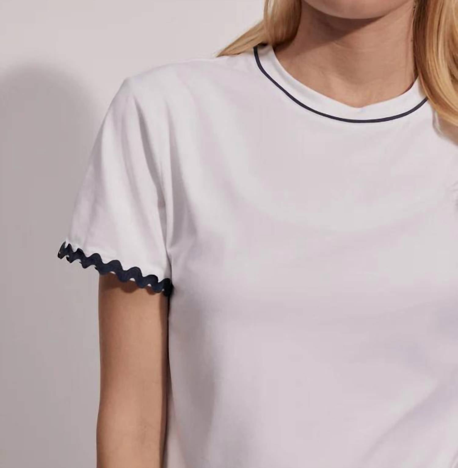 This classic, short sleeve tee will be your go-to staple this season and beyond. This classic crew neck t-shirt features scalloped edge sleeves and a piped crew neck. Made in our Recycled Micro Jersey. The Elodie is cut for a standard fit. Take your true size. Model is 175cm tall, with an 75cm bust, 61cm waist, 88cm hips, and wears a size small. Size S - Front Length: 23.2". Sleeve Length: 6.7". 88% Recycled Polyester, 12% Elastane. Machine wash cool, do not bleach, do not tumble dry, iron cool, do not dry clean, wash with similar colours, remove promptly from washer, line dry. Style #VAR01814.