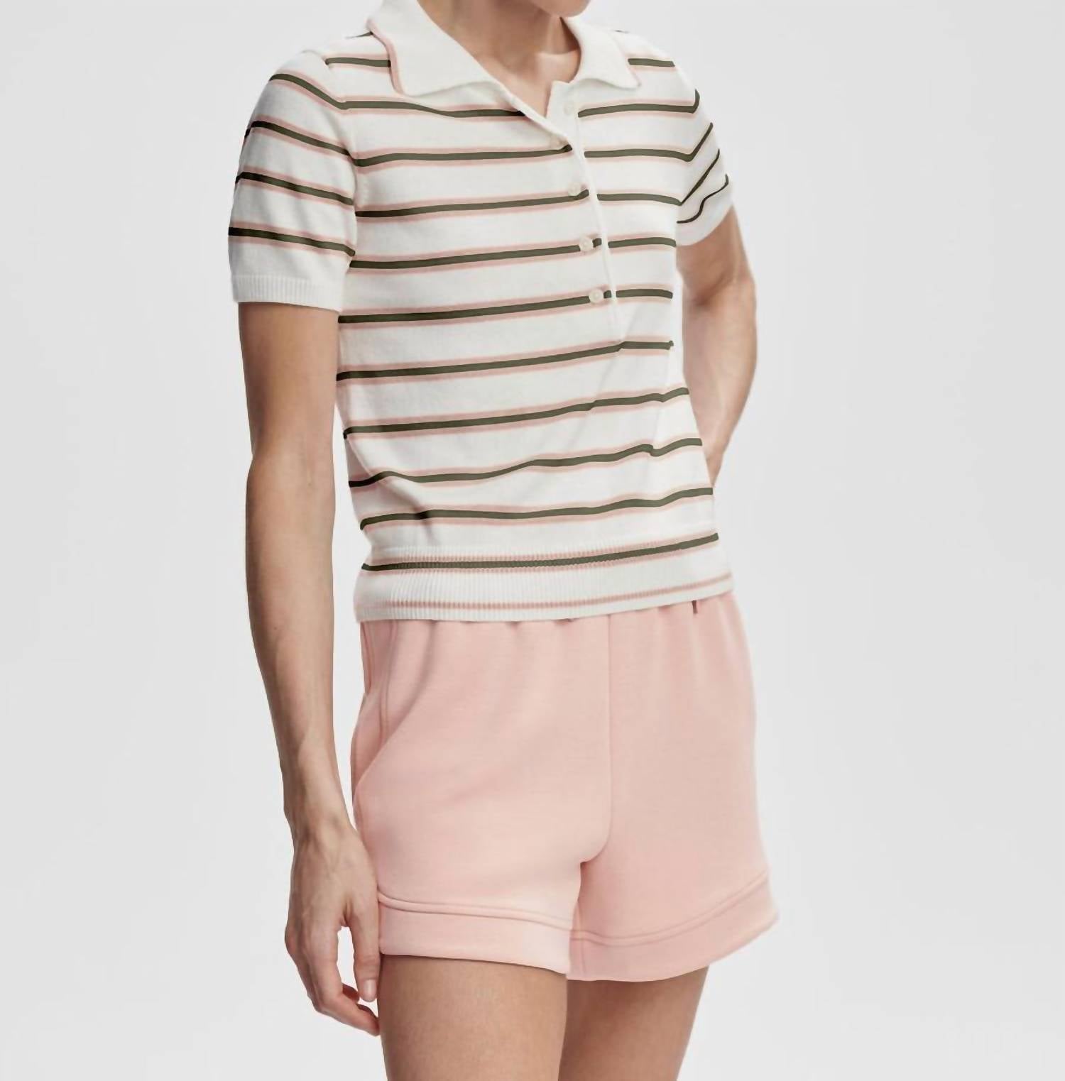 This classic, short sleeve tee will be your go-to staple this season and beyond. Elevate your style with the Faustine Button Stripe Neck Polo by VARLEY, designed to add a fresh edge to your wardrobe. Featuring short sleeves and crafted from a crisp cotton blend, this polo offers both comfort and style. Patterned with white and pink stripes, it includes a button closure for a classic finish. Care: Machine wash and line dry to maintain its refined look.
