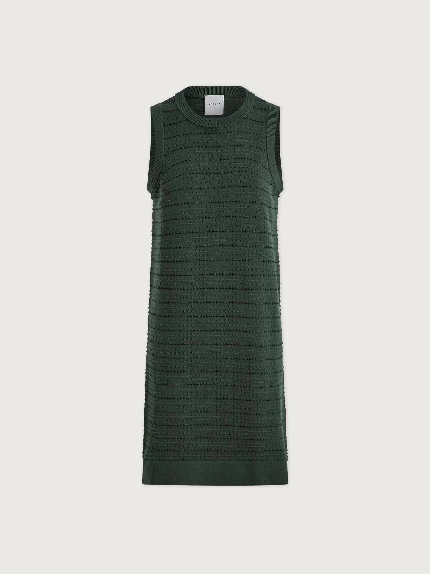 Comfortable and cute, this casual day dress has it all. Embrace minimalist elegance with the Mindy Contrast Stitch Knit Dress by VARLEY, presented in a refreshing cilantro hue. This sleeveless, crewneck sheath dress is crafted from 100% cotton in a fine gauge textured stitch, providing lightweight coverage with a stylish twist of contrast stitching throughout. Closure: Pull-on design. Care: Machine wash recommended. Perfect for vacation or St. Patrick's Day celebrations.