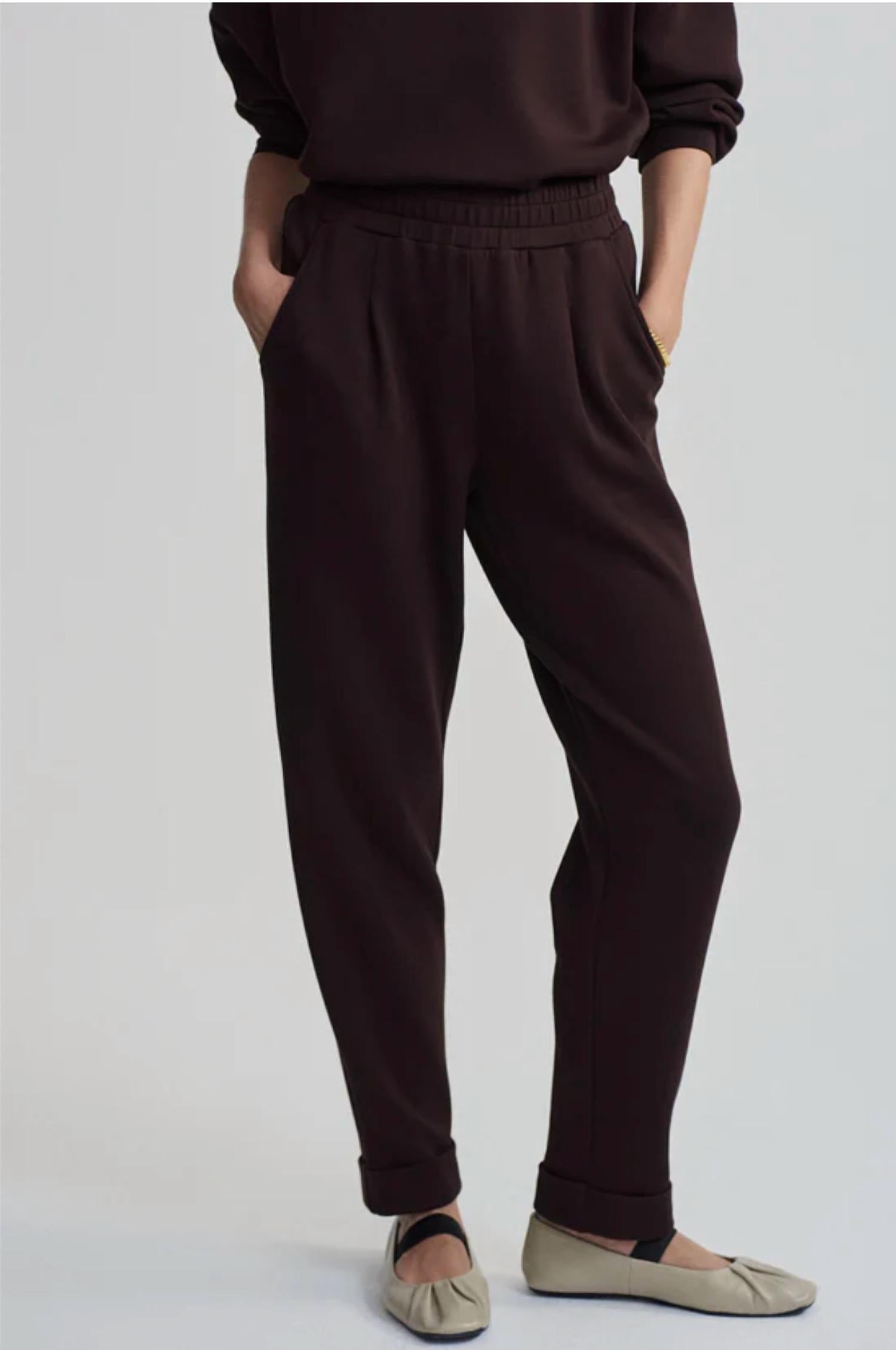 Discover the Rolled Cuff Pants by VARLEY, crafted in a sophisticated Coffee Bean color to enhance your wardrobe. These pants offer a high-rise, relaxed fit with a tapered leg and elegant rolled cuffs, perfect for a polished yet comfortable style. Made from 72% Viscose, 23% Polyester, and 5% Elastane, they feature shaped pockets and front and back darts at the waistband. Closure: Pull on. Care: Machine wash cool, do not bleach, do not tumble dry, cool iron, wash with similar colors, turn inside out, tie cords before washing, dry flat.