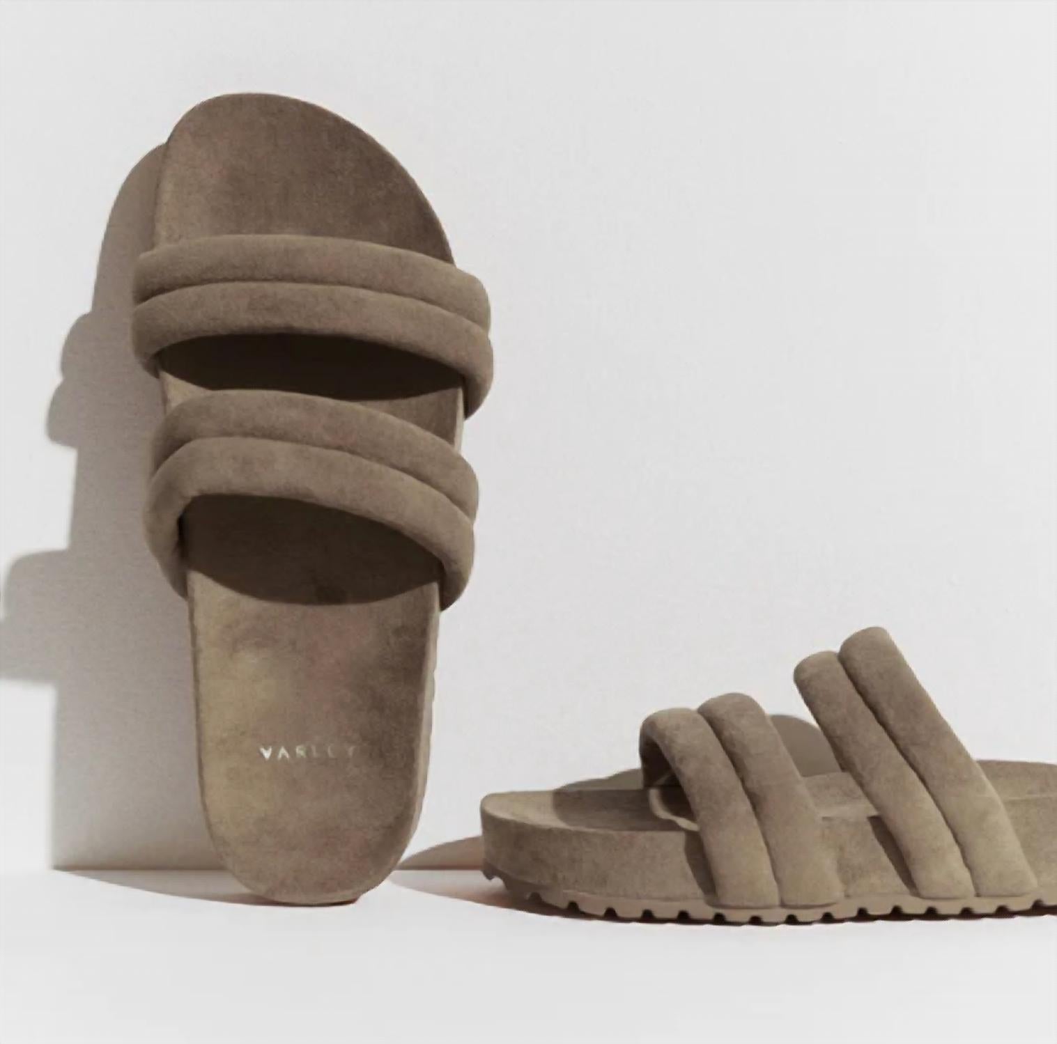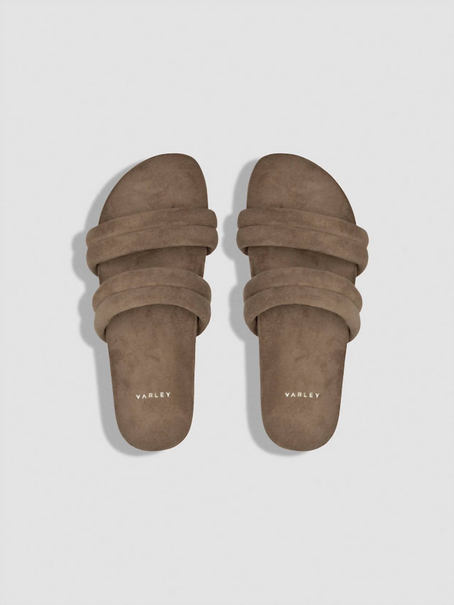 This sandal will take you from brunch to dinner and everything in between. The 2.0 version of the Giles slides are true to size. Crafted using ultra-soft faux suede, these slides feature a plush, quilted upper that adds an extra layer of sophistication. Main: 100% Polyester, Sponge: 100% PVC, Outsole: 100% TPR.