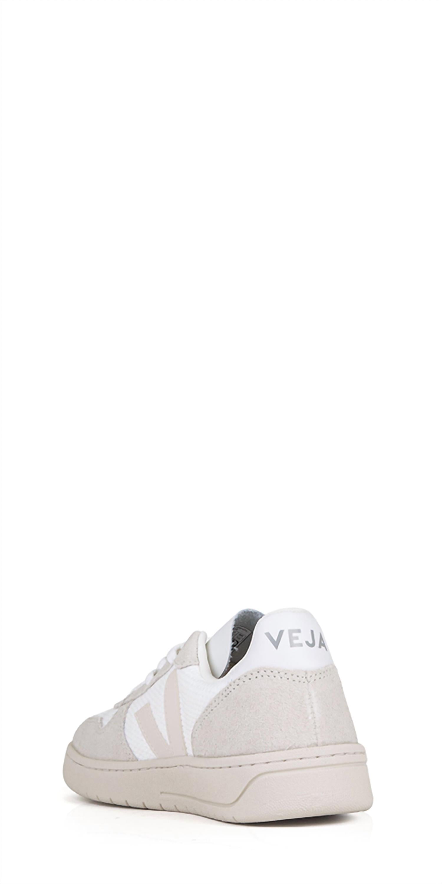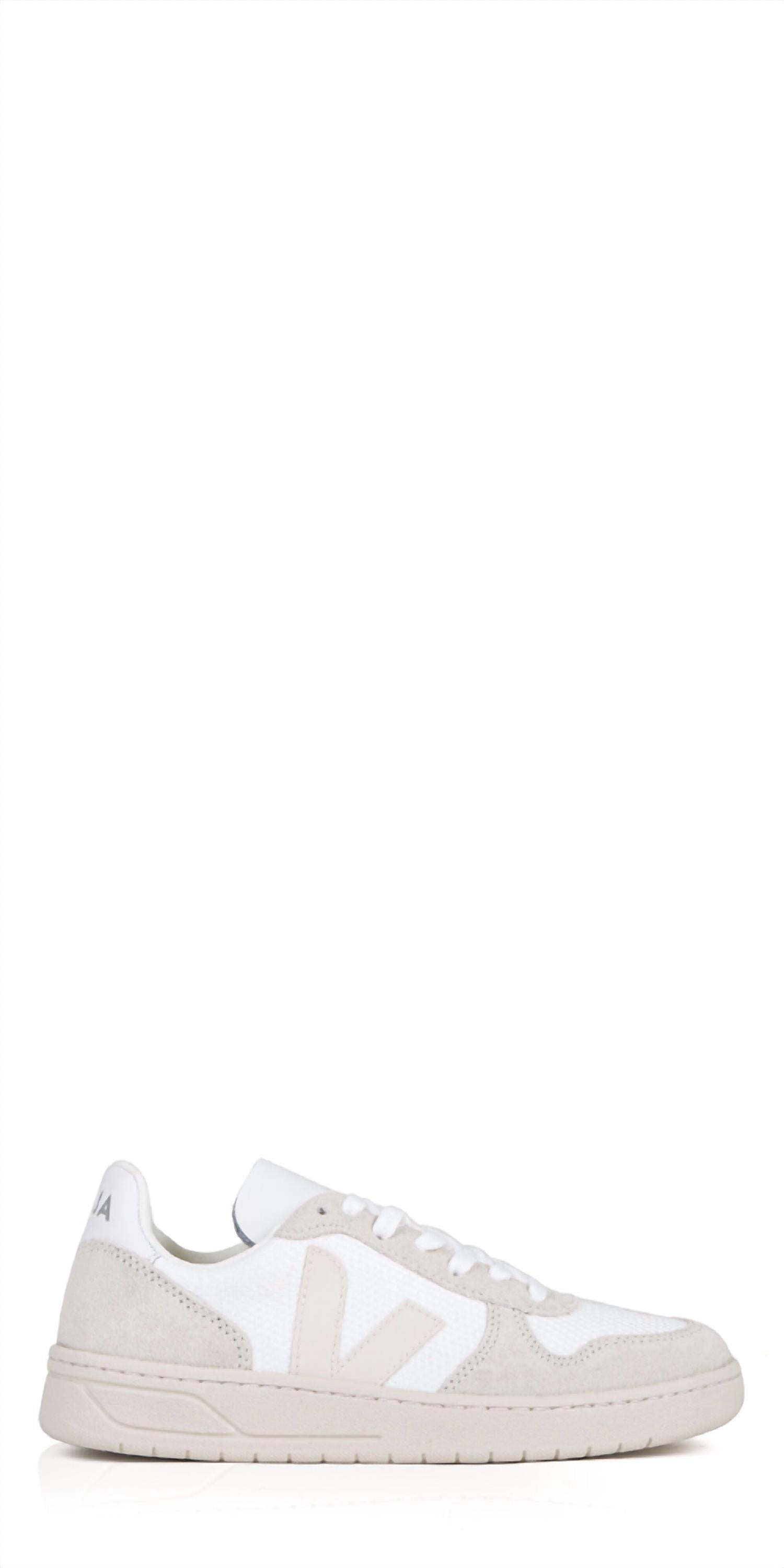 Get your daily steps in with these adorable sneakers. Step into style and sustainability with VEJA's Women's V-10 B-mesh Sneakers in White Natural Pierre. Crafted in Brazil, these sneakers are made from a unique blend of B-Mesh, suede, and leather, while featuring an Amazonian rubber sole. The innovative B-Mesh uses 100% recycled polyester from plastic bottles, offering a lightweight, breathable, and water-repellent finish. Perfect for vacation season, these round-toe, flat-heeled sneakers are an eco-conscious choice for your wardrobe.