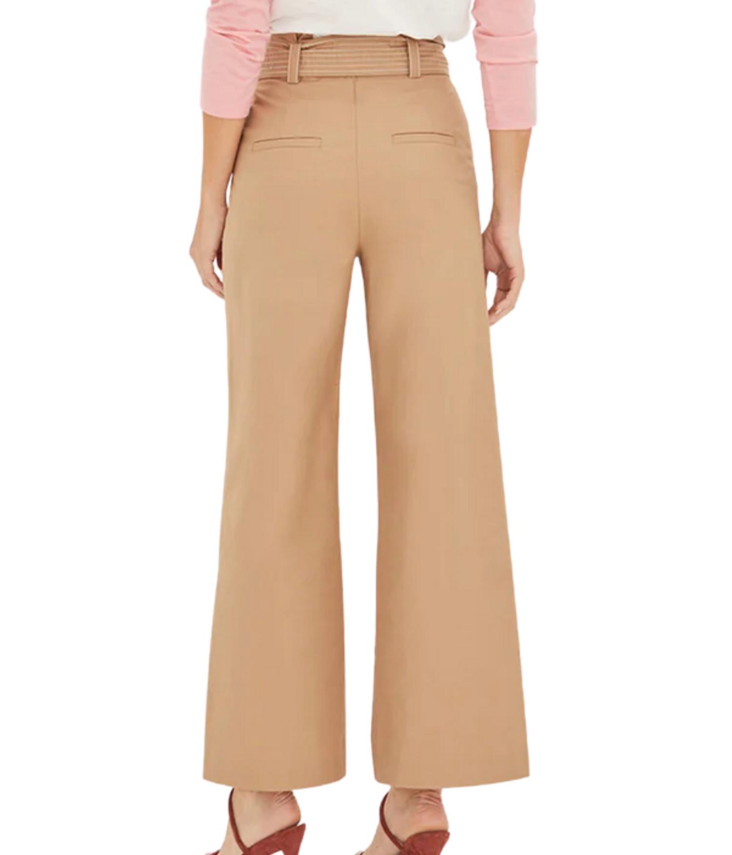 High waist with removable self tie belt. Side slip pockets. Back welt pockets. Wide leg. Slightly cropped. Fabric: 97% Cotton, 3% Elastane. Dry clean. Measurements - Rise: 14″, Inseam: 27″, Leg opening: 20 1/4″.