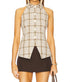 Sophisticated Dark Stone Multi plaid and check pattern. Sleeveless vest, crafted with a 98% cotton and 2% elastane blend and lined with 100% viscose, offers a medium weight textured crepe fabric perfect for spring travel and workwear. With its collared styling and front button closure, exudes effortless charm. Made in US. For care, dry clean only.