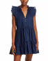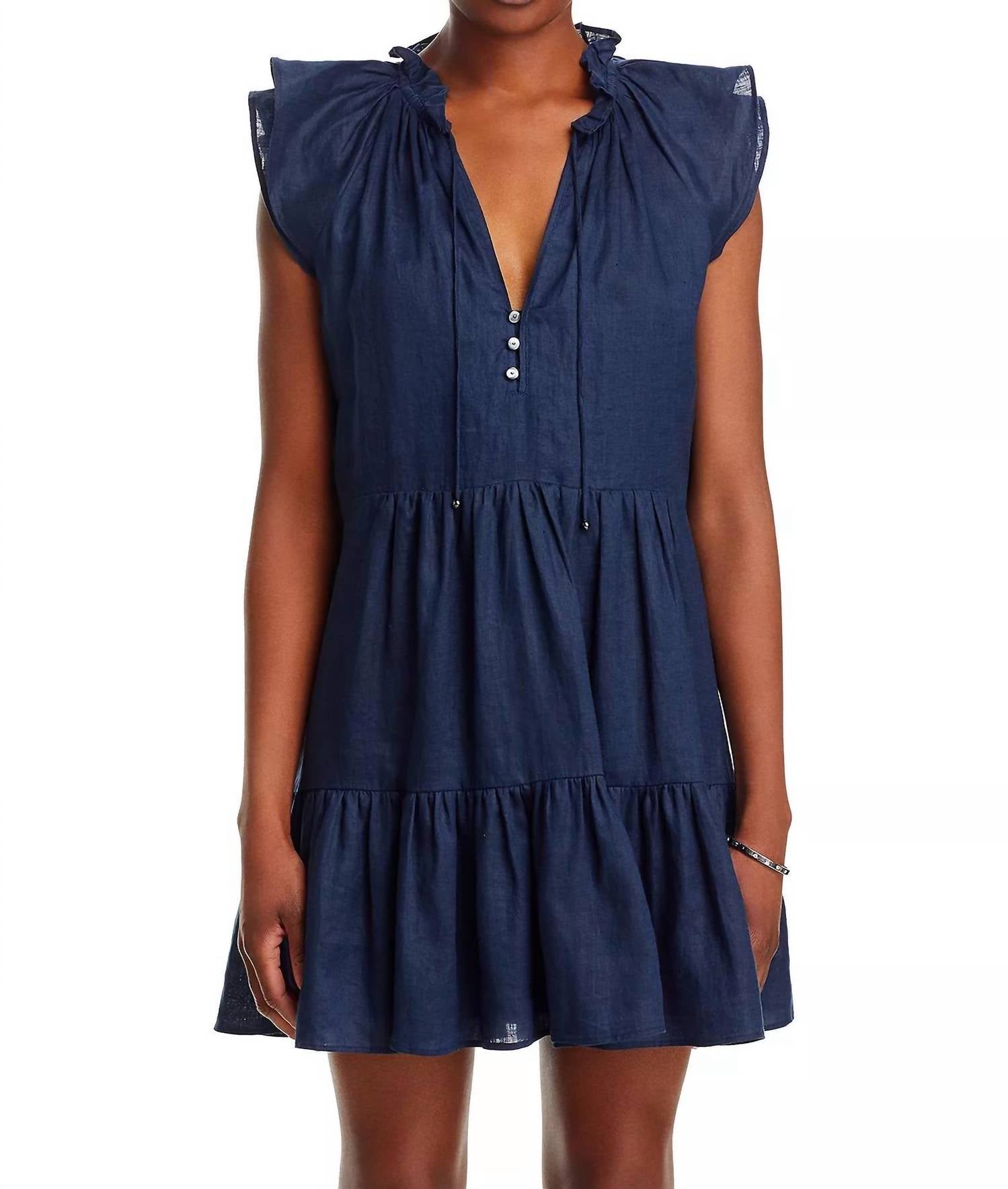 Features a Notch V-neck adorned with ruffled trim, a three-button closure, and tie detail, enhancing its elegant appeal. The tiered flutter cap sleeves add a touch of charm, complementing the tiered design at the body. The dress is fully lined and made from 100% cotton, requiring dry cleaning for proper care. It is designed to fit true to size, with an approximate length of 34 inches based on a size 2. The model, standing at 5 feet 10 inches tall, is wearing a size 2 for reference.