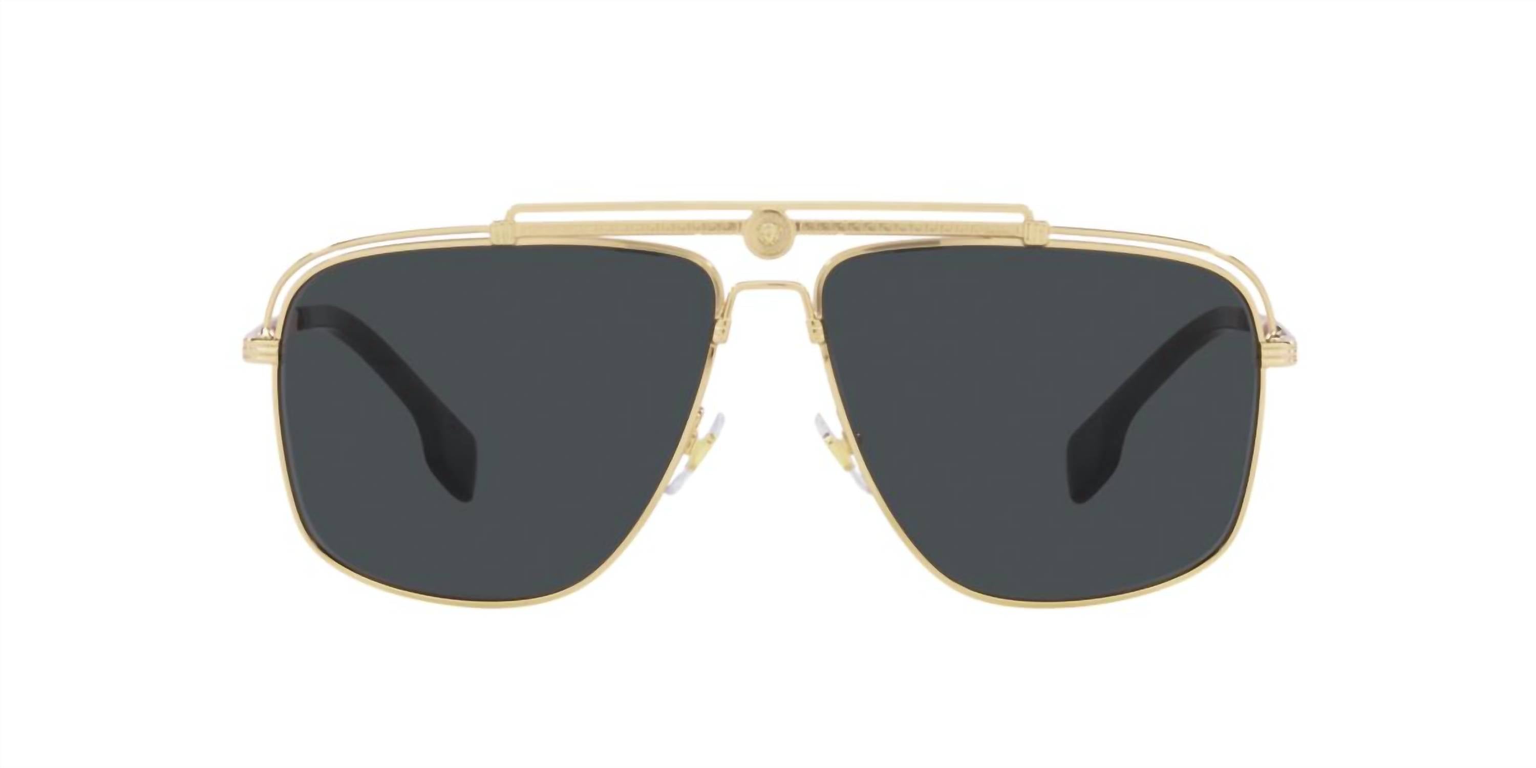 Make a statement and shield your eyes in these fashionable, yet practical sunglasses. Grab these adorable shades for your next vacation and elevate your accessory game. The Versace VE2242 100287 61 sunglasses feature a stylish golden square frame with grey lenses, made from durable metal, measuring 13 mm in bridge width and 145 mm in sideburn length, and are non-polarized for versatile wear.