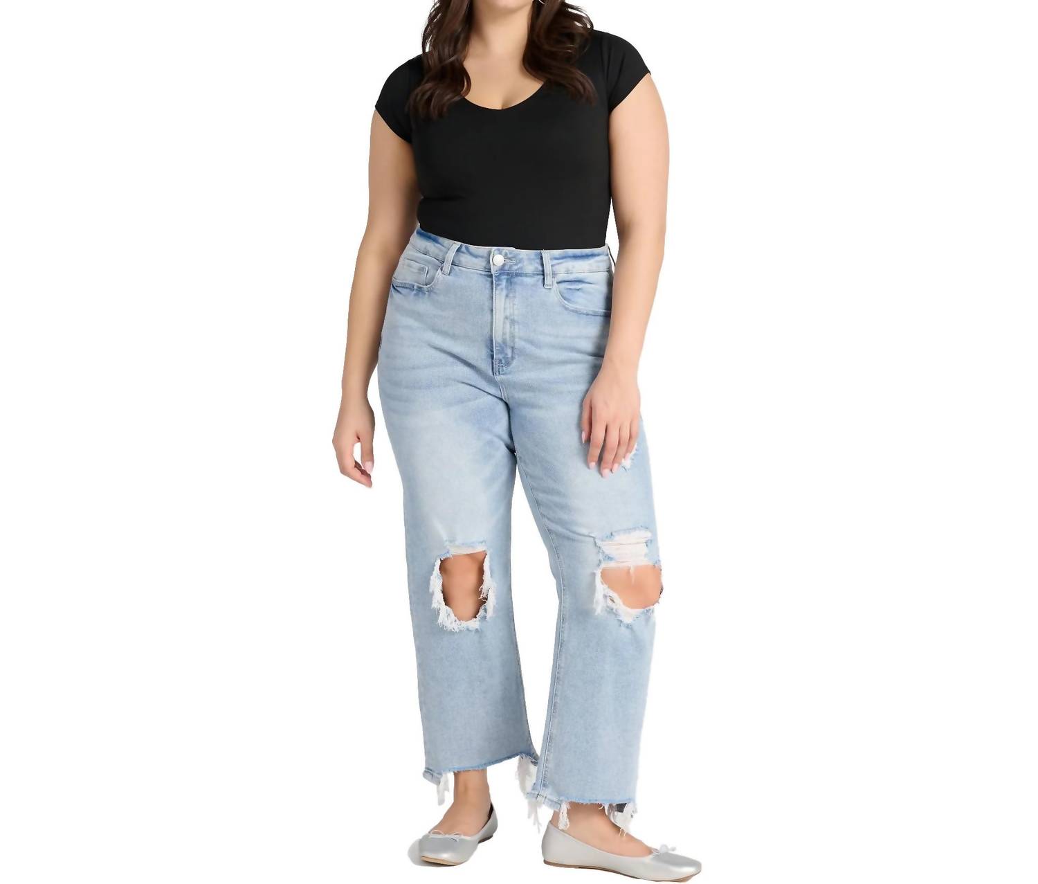 This classic straight leg jean has a perfect fit and goes with just about everything. Elevate your denim collection with the VERVET BY FLYING MONKEY 90's Vintage Dad Jeans in Celebration, an essential blend of comfort and style. These high-waisted, straight-leg jeans are crafted from denim with a composition of 94.5% Cotton, 4.5% Polyester, and 1% Spandex, ensuring a light stretch fit. Featuring five pockets and a zip closure, they showcase generous distressing, raw-cut hems, and subtle washed details for a truly retro look. Care instructions include machine wash and tumble dry. Model's measurements are 5'10" in height, 41" bust, 48" hip, and 35" waist, wearing a plus size.