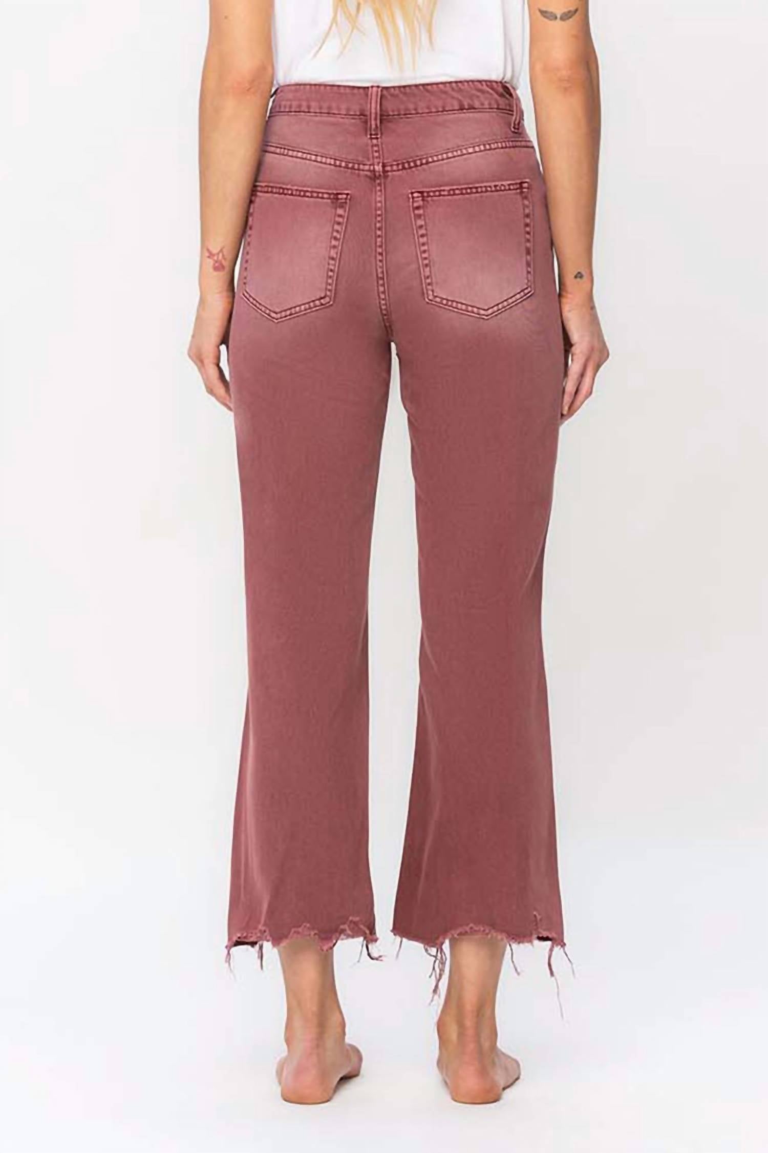Just as cute as they are comfortable. Revisit nostalgic fashion with the 90's Vintage High Rise Crop Flare Jeans by VERVET BY FLYING MONKEY. These russet brown jeans boast a high-rise fit with a flared leg and a 25.5-inch inseam, bringing 1990s aesthetics back with a modern twist. Crafted from 100% cotton, the solid pattern and button closure offer both style and practicality. Made in China, these jeans require hand washing and can be tumble-dried for easy care. Model is wearing size 26, standing at 5'9".