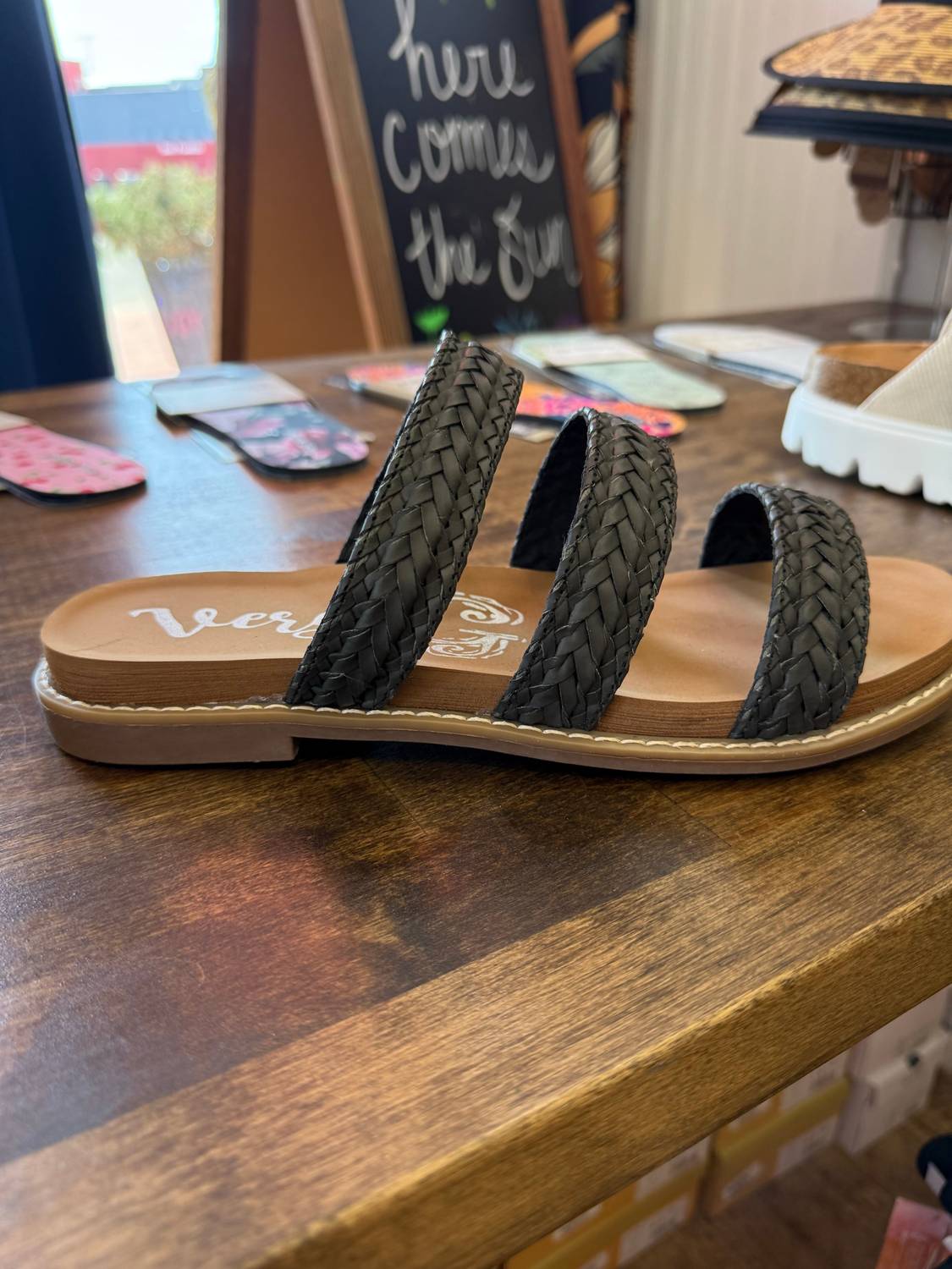 Introducing the Women's Alba 3-strap Braided Sandal by Very G, a minimalist black sandal perfect for summer vacations and Thanksgiving gatherings. Designed with an open toe and medium shoe width, it features three braided straps crafted from durable PU leather. The flat heel provides a low and comfortable lift with a soft memory foam footbed ensuring a true-to-size fit. Perfect for any occasion, this versatile sandal offers both style and comfort for adults seeking a chic yet relaxed look.