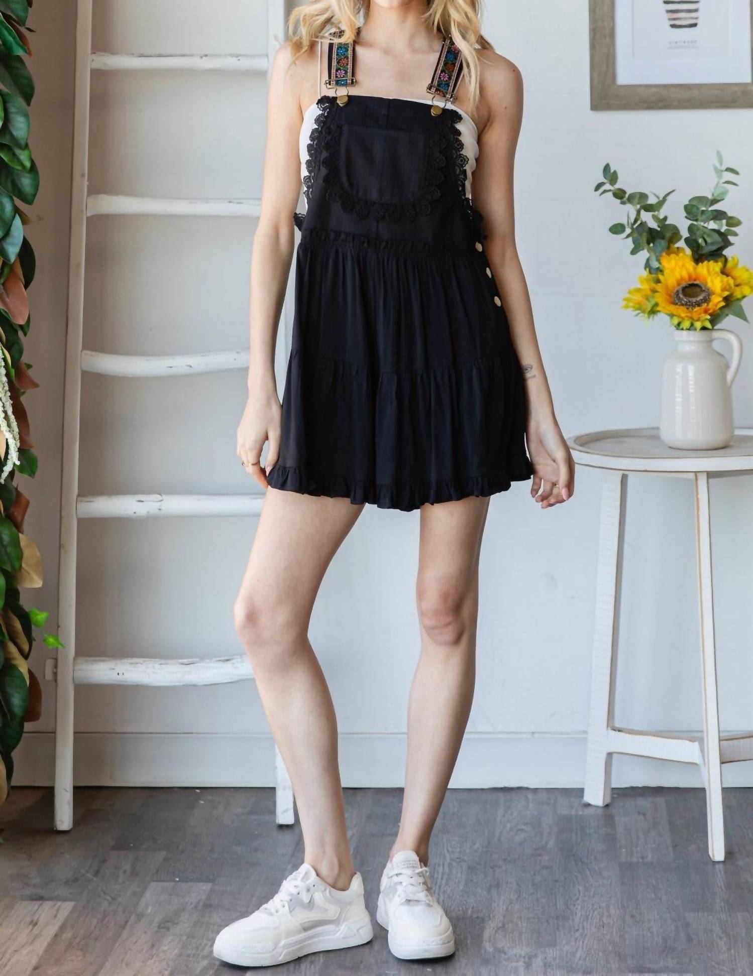 Introducing the Eloise Overall Romper by Veveret, a textured wide-leg piece for women that offers a high-rise fit with button closure. Crafted from 100% Cotton, this romper in classic black features stylish embroidered straps with gold accents and delicate lacy detailing. Ideal for summer vacations, it's equipped with practical pockets to enhance functionality. For care, hand wash and line dry to maintain its minimalist appeal.
