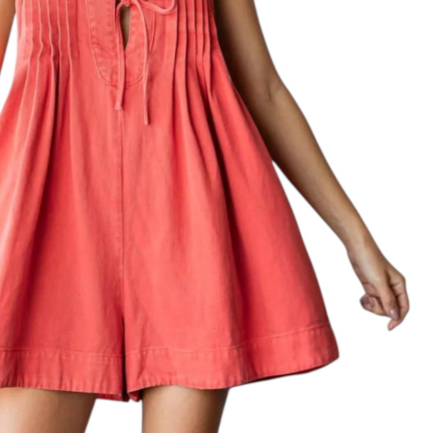 Introducing the V-neck Puff Sleeve Denim Short Romper by Veveret, a standout piece in vibrant coral perfect for a casual summer outing. This romper not only features a chic sleeveless design and a deep V-neck with a string tie but is also made from 100% cotton, ensuring comfort and breathability. Its mini length and relaxed, wide-leg fit make it a trendy choice for Y2K-inspired looks. With convenient side pockets and a pull-on closure, it's ideal for vacation or Thanksgiving gatherings. Model is 5'10" and wearing a size Small.