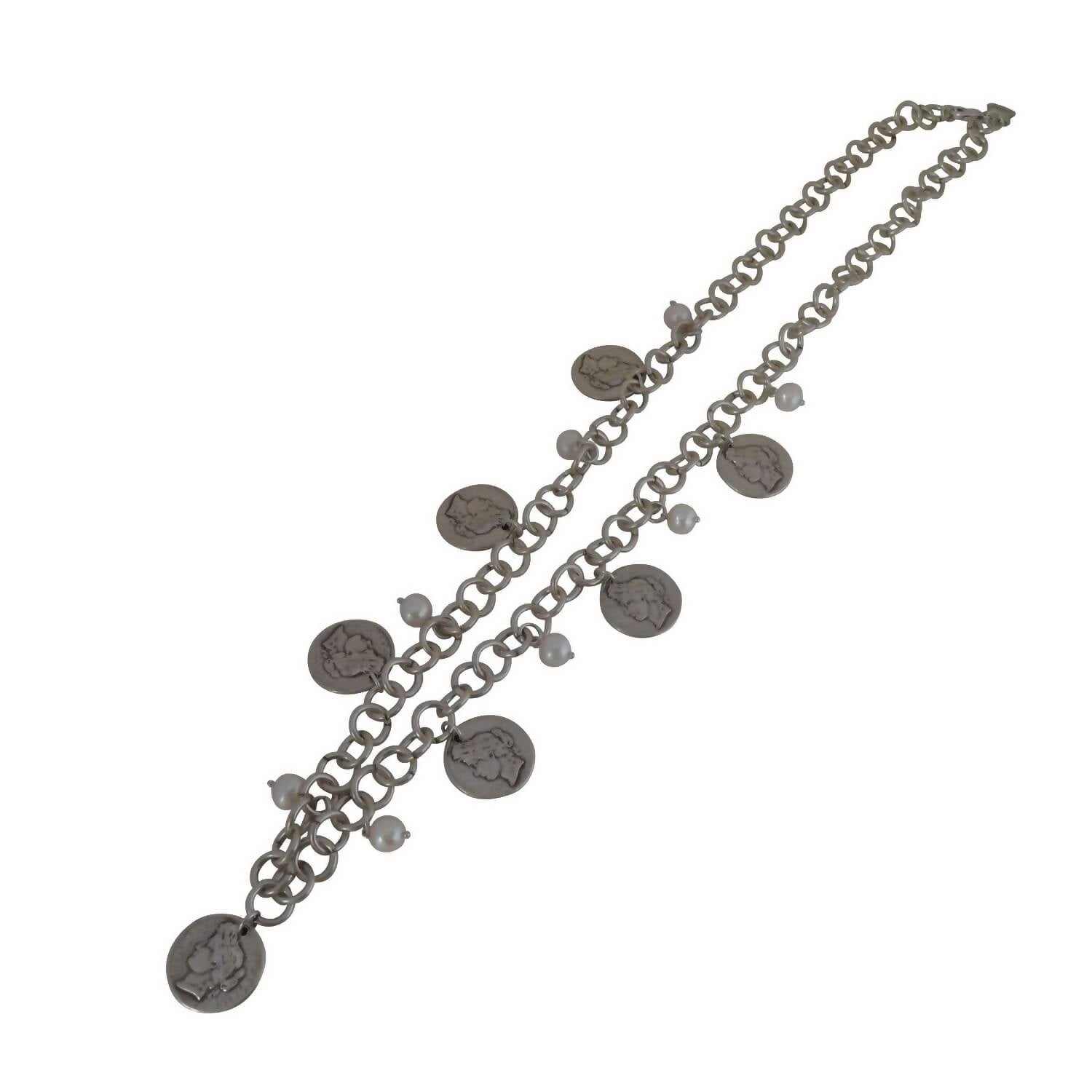 The perfect stand-out necklace that complements even the most basic t-shirt. Introducing the Women's Follis Necklace by Vidda, a standout piece from the Oyster Collection. Measuring 35.5 inches, this silver-hued necklace captures attention with its dangling charms of antique coins and cultivated pearls, set in elegant gold plating. Crafted with Vidda's signature commitment to quality, this necklace offers a fresh and sophisticated aesthetic for everyday wear. Although the country of origin is unspecified, this fashion jewelry remains a testament to timeless elegance.