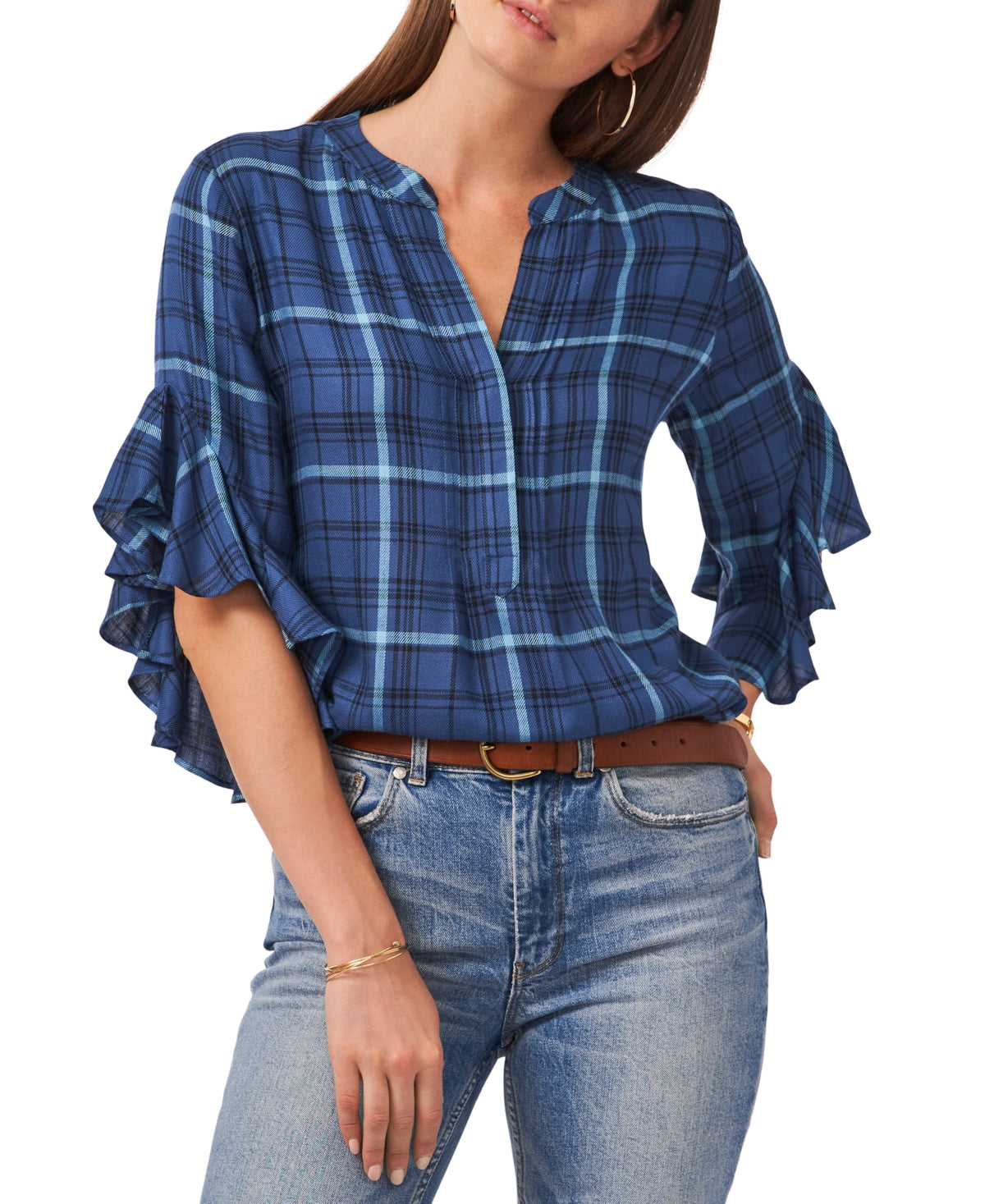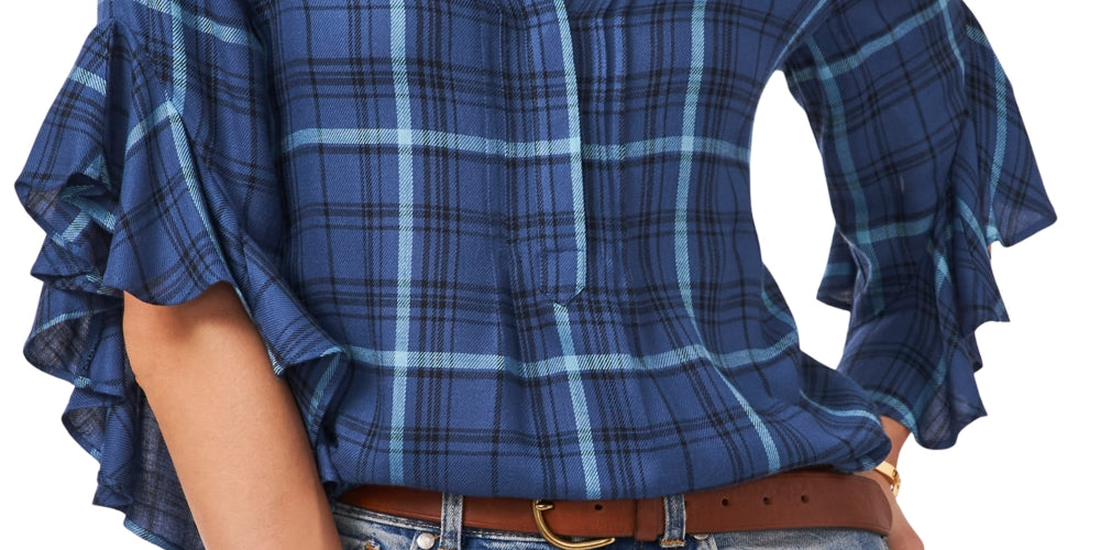 Vince Camuto Women's Plaid Ruffle Sleeve Top Blue Size X-Small
