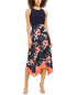 Turn every head in this eye-catching Vince Camuto dress| with an asymmetrical hem and contrast floral-print skirt. | Approx. 45 long from center back neck to hem. Length is based on size 6 and varies 1/4 between sizes| Round neckline| Zipper closure at back| Floral print skirt; asymmetrical hem| Shell; polyester; lining; polyester