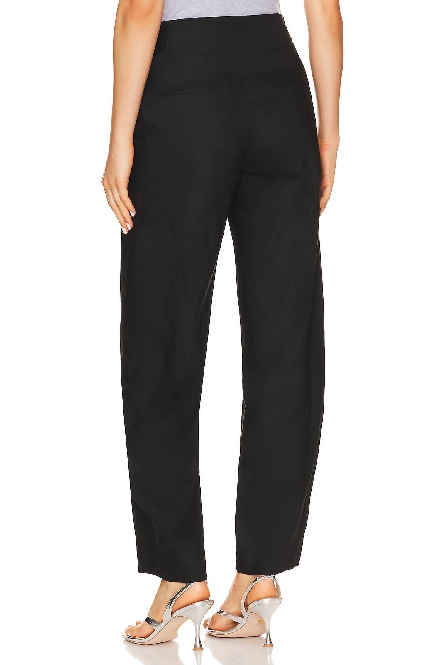 Introducing the High Waist Tailored Utility Trouser by Vince, crafted from a comfortable linen blend for a sleek, polished look. Made in China, these versatile black trousers feature a high-rise fit with a zip fly and hook-and-bar closure. With practical design elements like side slant and back welt pockets, plus a side cargo pocket with zipper closure, they offer both style and function. Care: Hand wash and lay flat to dry. Dimension highlights include a 32" inseam, 10" rise, 22" knee opening, and 16" leg opening for a flattering straight leg shape.