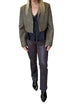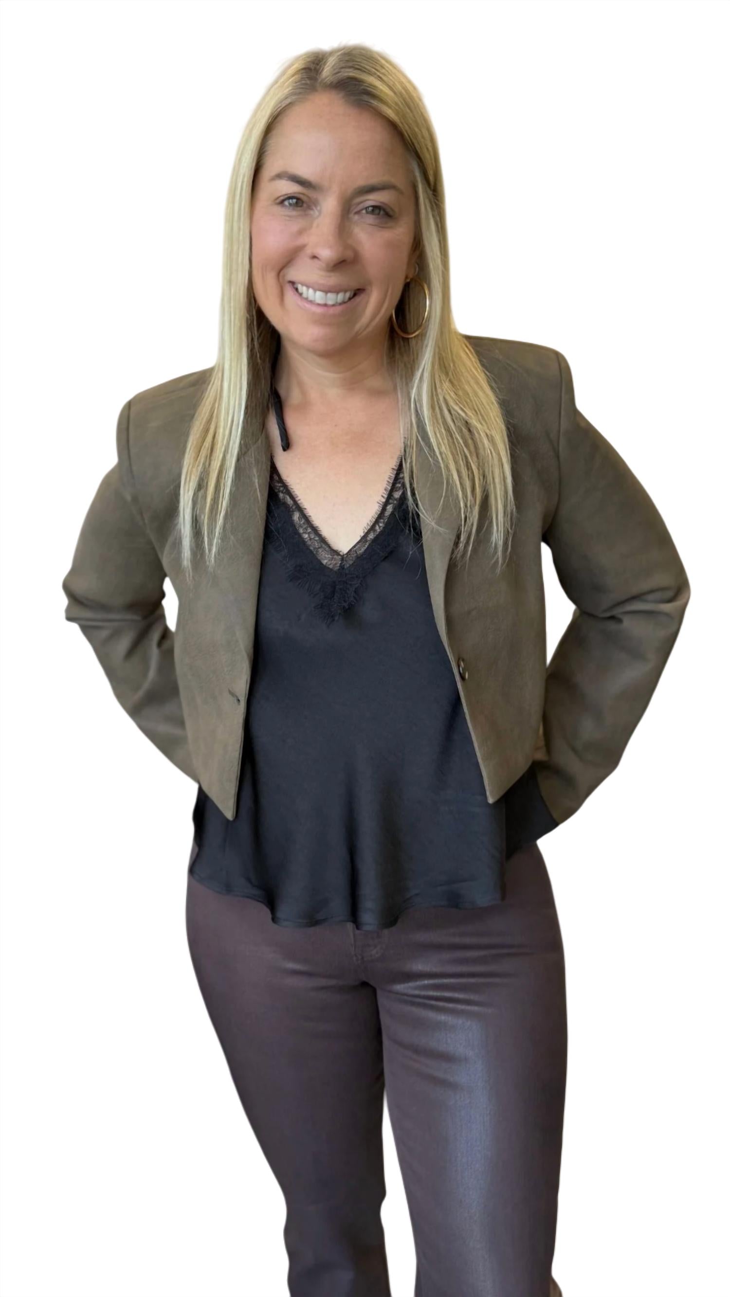 Elevate your evening ensemble with the Faux Leather Cropped Blazer by Vintage Havana, a sophisticated choice for any preppy wardrobe. This women's blazer in olive is designed with long sleeves and a collar, featuring a button closure. The shell composition combines 75% polyester with 25% polyurethane, and it is fully lined with 100% polyester for a refined finish. Perfect for spring occasions, this solid-patterned blazer is an elegant addition to your collection.