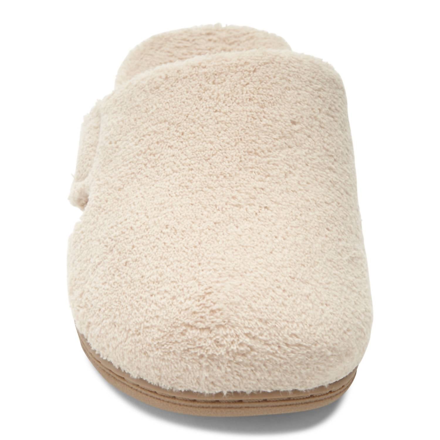 Slip into these, we promise you won't regret it. Indulge in comfort designed in elegant tan for in-home luxury. Spa-style mule slippers. Feature a closed toe with a round shape and an adjustable hook-and-loop closure, ensuring a perfect fit. Crafted with a 100% polyester terrycloth footbed and textile upper. Provide podiatrist-designed arch support and a deep heel cup to promote healthy alignment. Include a flexible EVA midsole for shock absorption. Low 1.3-inch flat heel for a comfortable stride.