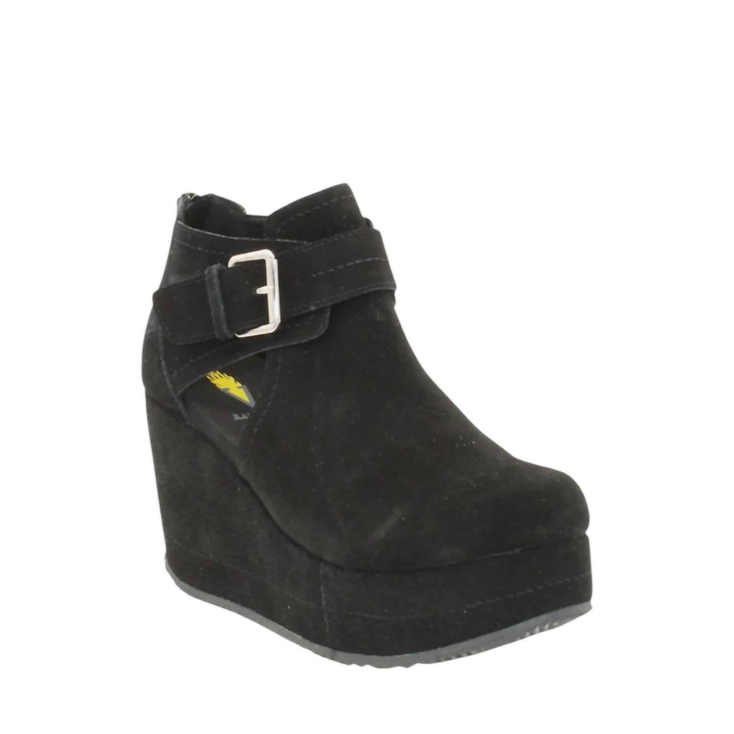 Elevate your fall wardrobe with the Women's Romford Wedge Booties by VOLATILE, a perfect blend of style and function. Crafted from black suede, these booties feature a chic round toe silhouette and a sleek 3-inch wedge heel for a comfortable lift. An adjustable ankle strap buckle and side zip closure add versatility and a hint of moto edge to these imported shoes. Composition includes a leather upper with a synthetic lining and a rubber outsole, making them ideal for travel and Thanksgiving occasions.