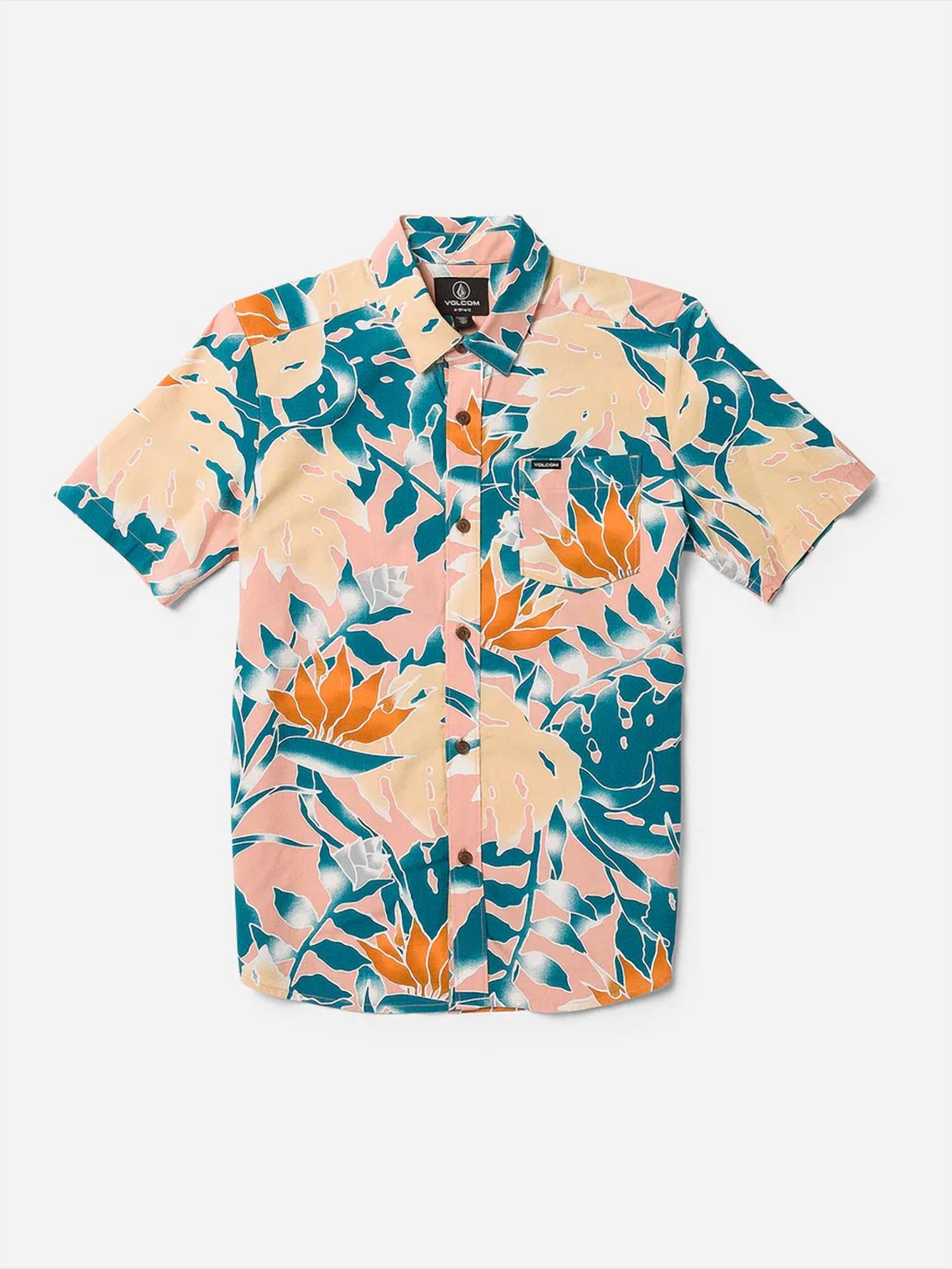 Introduce him to laid-back style with the Big Boys Leaf Pit Floral Button Up Shirt by Volcom, perfect for channeling vacation vibes. This short sleeve shirt, crafted in a soft and fluid cotton-viscose blend, features a button front and a classic fit complemented by a chest pocket and custom logo buttons. Composition: 55% Cotton, 45% Viscose. Care: Machine wash.