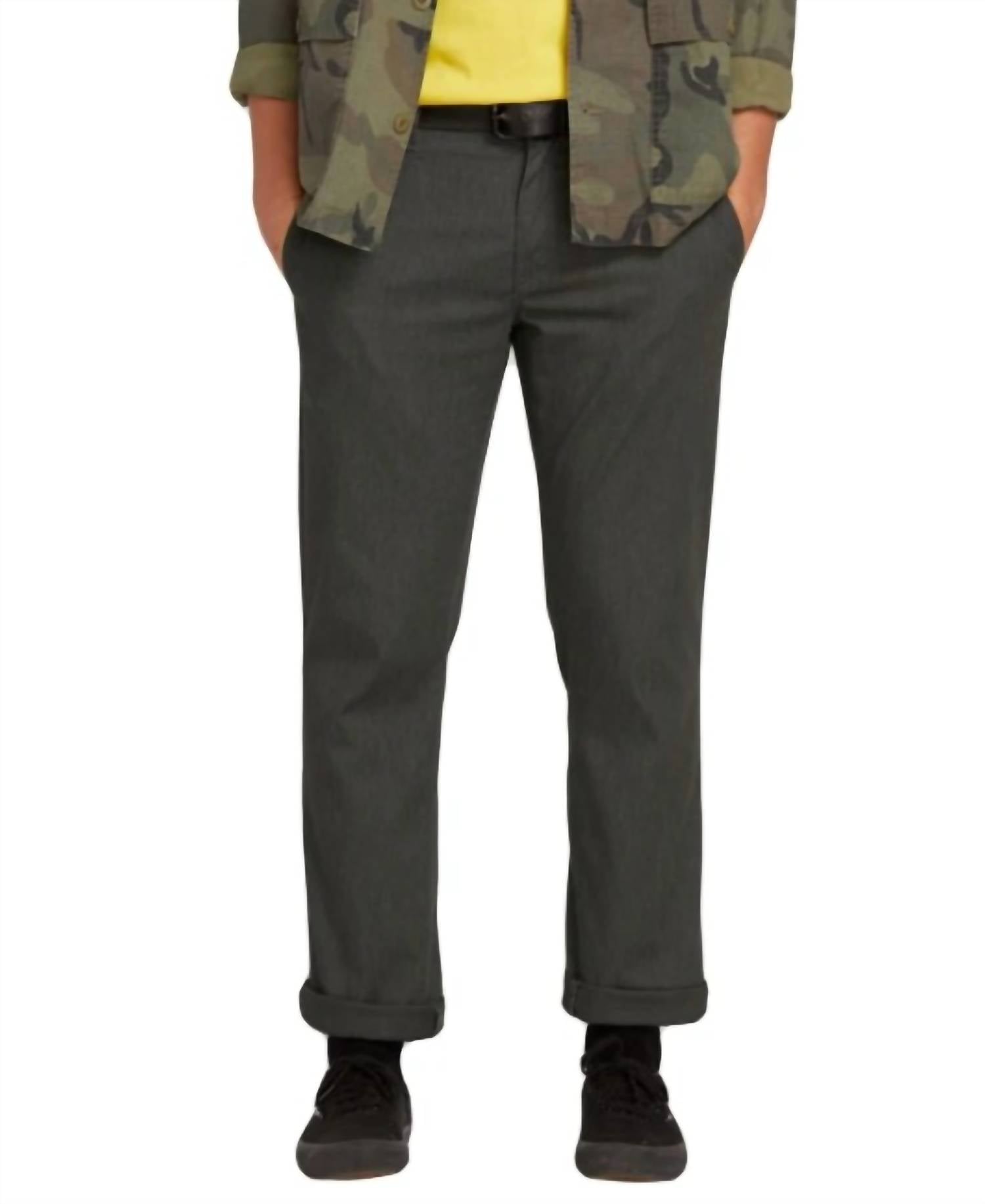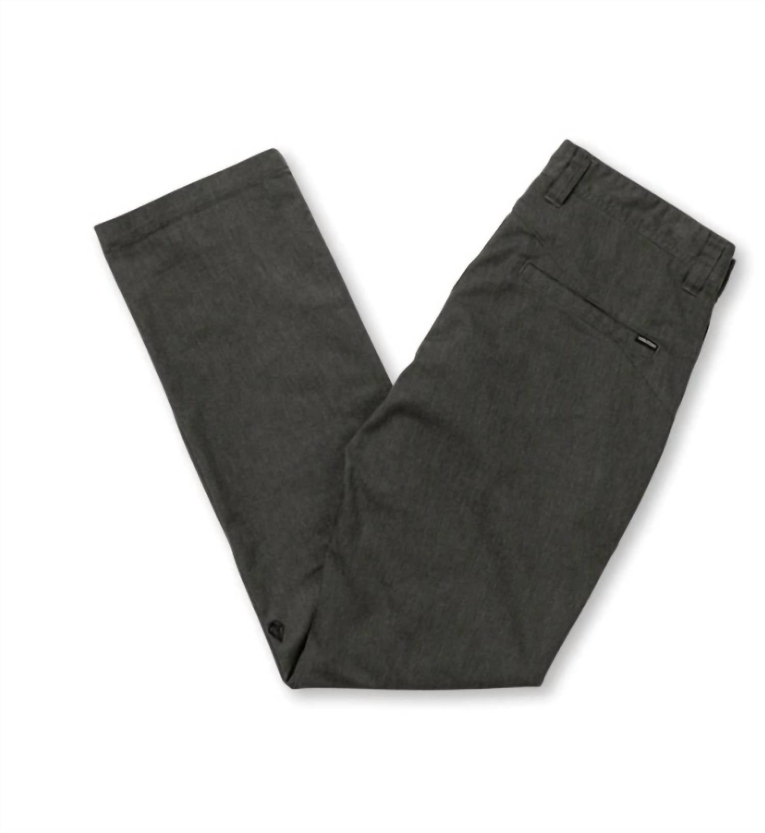 Introducing the Frickin Modern Stretch Pant by Volcom, a standout from the Eco-True collection in Charcoal Heather. These men's chino trousers offer a modern fit with a 16" (41 cm) leg opening and a regular rise, crafted from a sustainable blend of 59% cotton, 39% recycled polyester, and 2% elastane. With front slash hand pockets and signature asymmetric back yoke, these pants feature a button closure for a secure fit. Designed for everyday comfort, these pre-laundered pants make care easy with machine wash and tumble dry instructions.