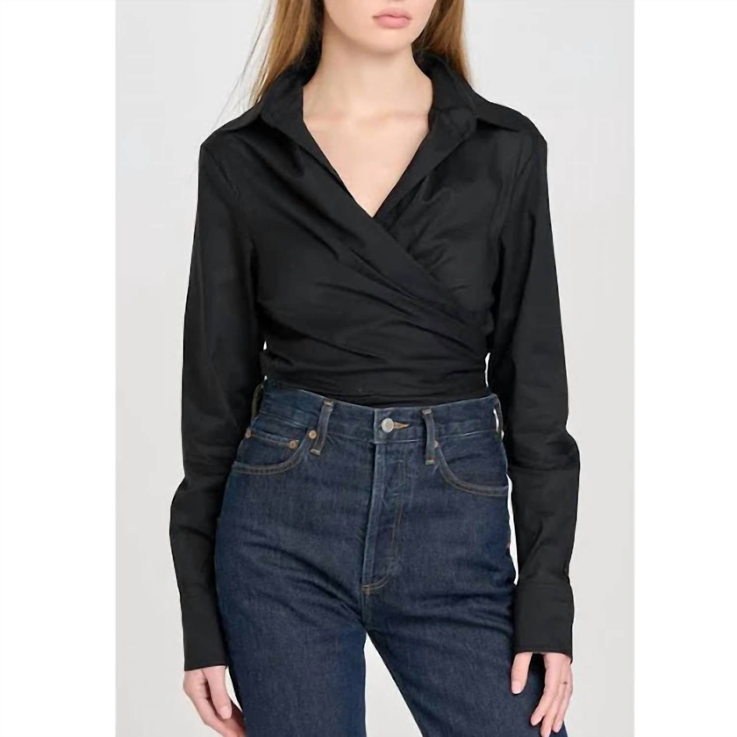 Introducing the Amelie Wrap Shirt by WAYF, a chic addition to any wardrobe in a timeless solid black. This stylish blouse offers long sleeves and a flattering 20" length crafted from 100% crisp cotton, ensuring both comfort and elegance. Showcasing a collared neckline and wrap detail with a statement bow. Care for this garment is simple with machine wash and lay flat to dry instructions.