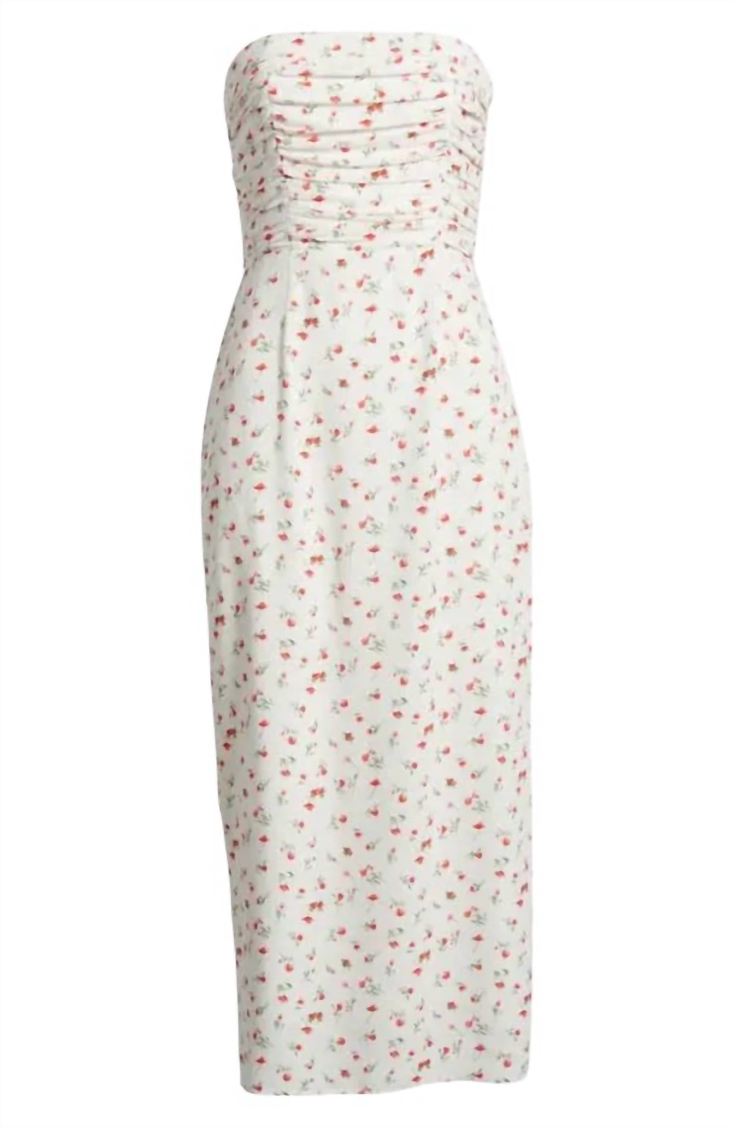 A midi dress so versatile, your options for wearing it are endless. Introducing the Birdie Ruched Strapless Midi Dress by WAYF, a standout piece in Ivory Ditsy. This strapless dress features a chic off-the-shoulder design with elegant side slits and ruched detailing, perfect for fluid movement. It is composed of 100% viscose and falls at a midi length of 43 inches, complete with a hidden back zip closure. Care for this lined dress with dry cleaning.