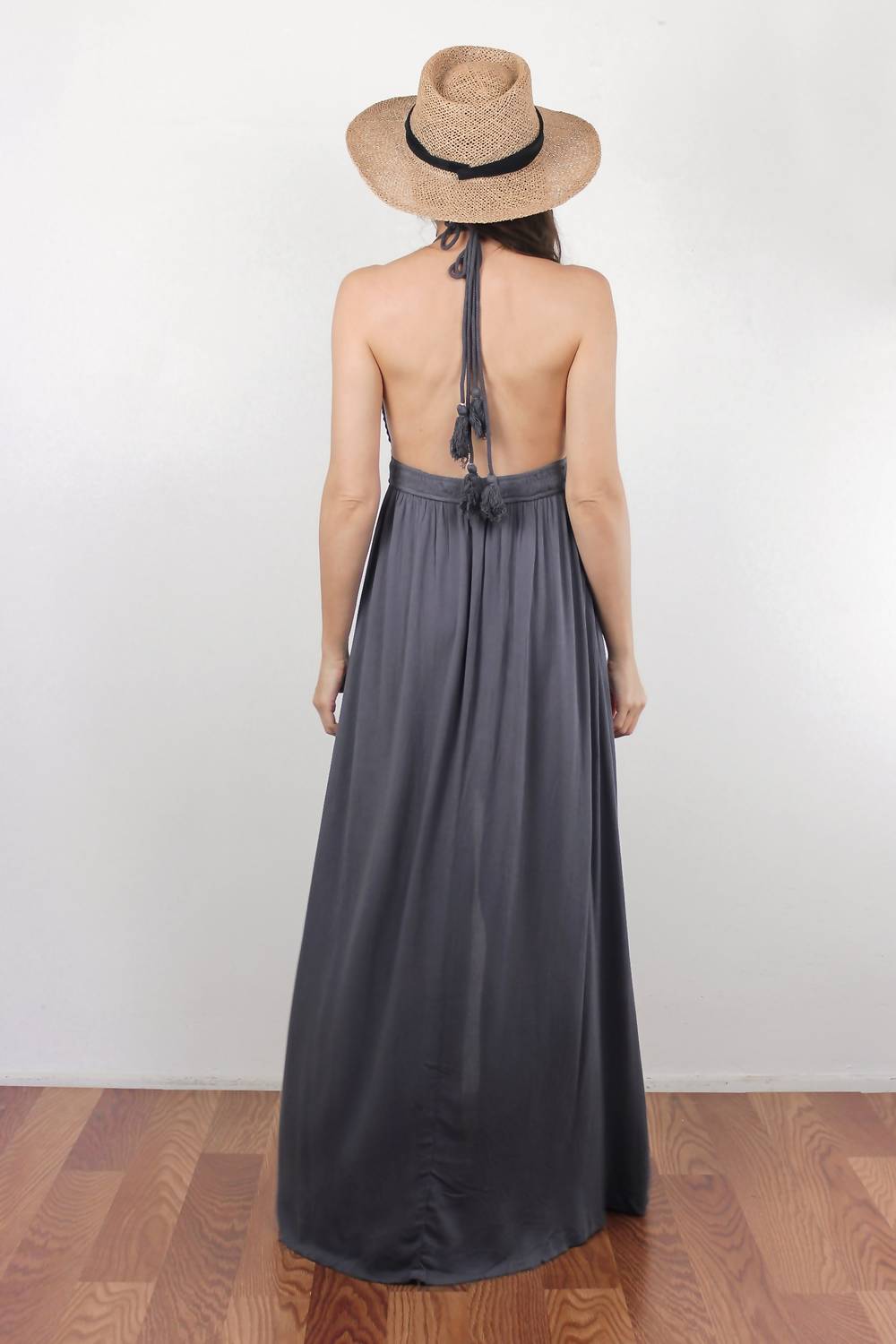 Discover the Olivia Maxi Dress by Wishlist, a stunning addition to your summer wardrobe in a sophisticated charcoal hue. Embrace the sleeveless halter style with a charming tassel tie closure and revel in the elegance of a crochet-detailed bust, fully lined for comfort. Crafted from 100% Rayon with a 100% cotton crochet detail, this A-line silhouette features an alluring front leg slit and an elastic bustline for a secure fit. Care instructions suggest hand washing to maintain its delicate design.