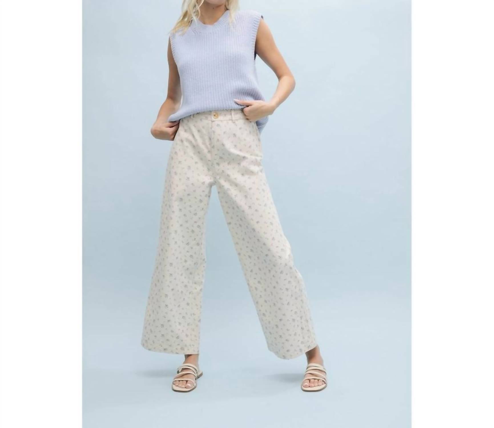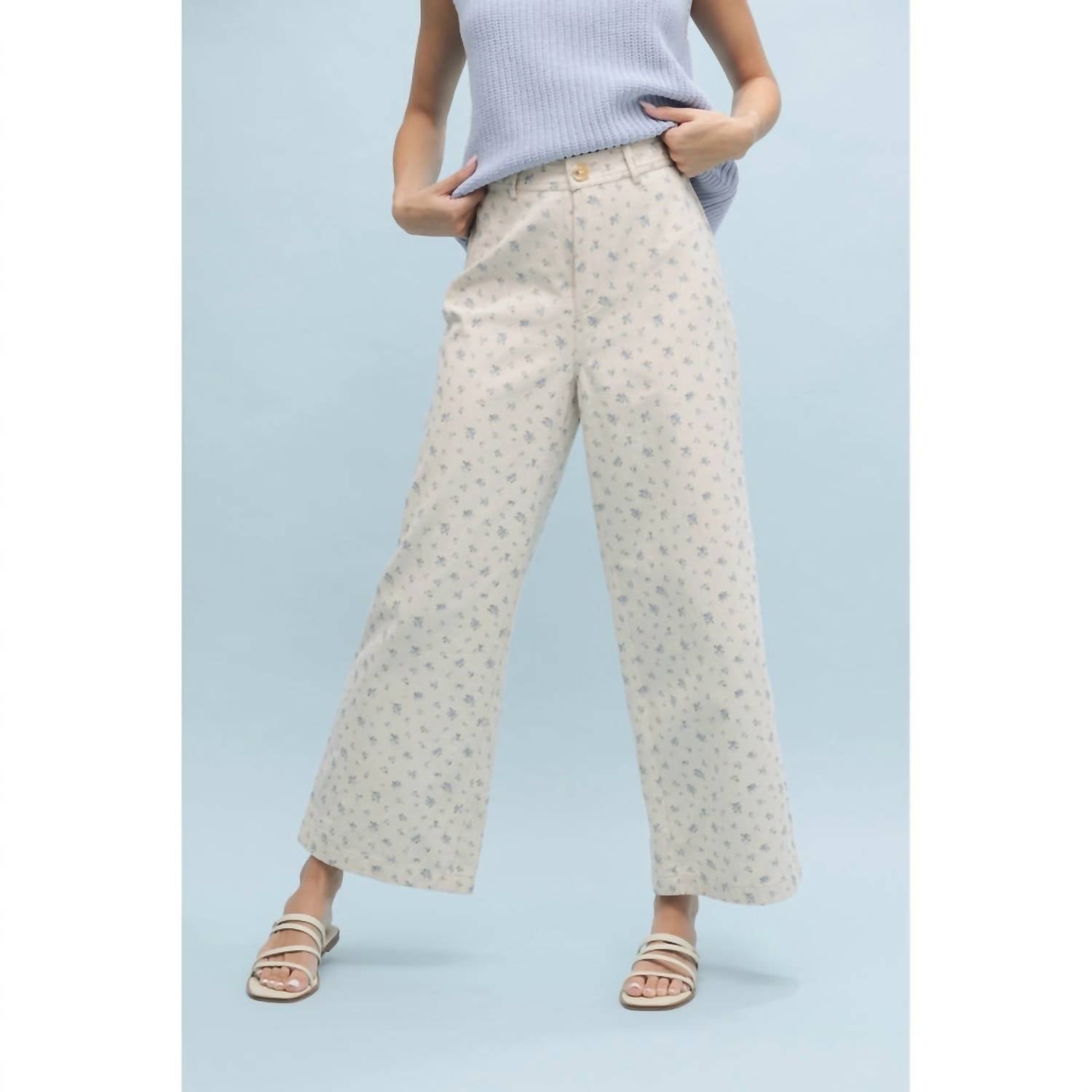 Slightly flared pants are all the rage right now and these are no exception. Pair these with your favorite tee for a more casual look, or with your favorite button-up blouse for an evening out. Embrace endless springtime charm with the Petal Perfect Floral Pant by WISHLIST, designed for women who adore comfort and flair. These taupe and blue floral pants feature a high-rise waist and a flared leg style, crafted from 100% cotton for breathable ease. A button closure secures the look, complemented by practical back pockets and an elastic back waistband for added flexibility. Perfect for versatile styling, these pants have a 27" inseam and pair beautifully with casual tees or chic blouses for any occasion.