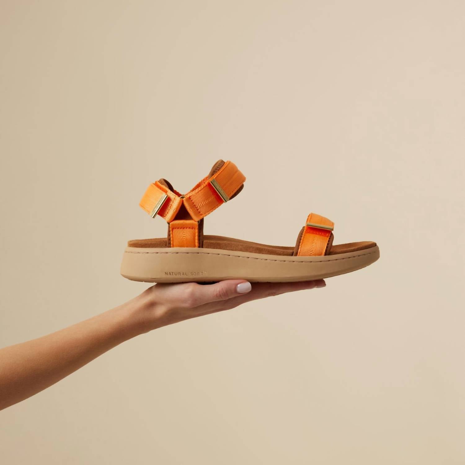 Classicly cute and all-day-wearable. We love this sandal. Introducing the Women's Line Sandals by Woden, a perfect blend of style and comfort for your summer wardrobe. These sandals feature an open toe design and are crafted from durable rubber, providing an ultra-soft walking experience with a dual-density PU midsole. Made in Europe, the sandals boast a durable outsole consisting of natural rubber combined with ordinary and at least 10% recycled rubber. Ideal for vacations or holiday festivities, they're designed in a vibrant Tiger color, ensuring a sleek look whether paired with shorts or dresses.