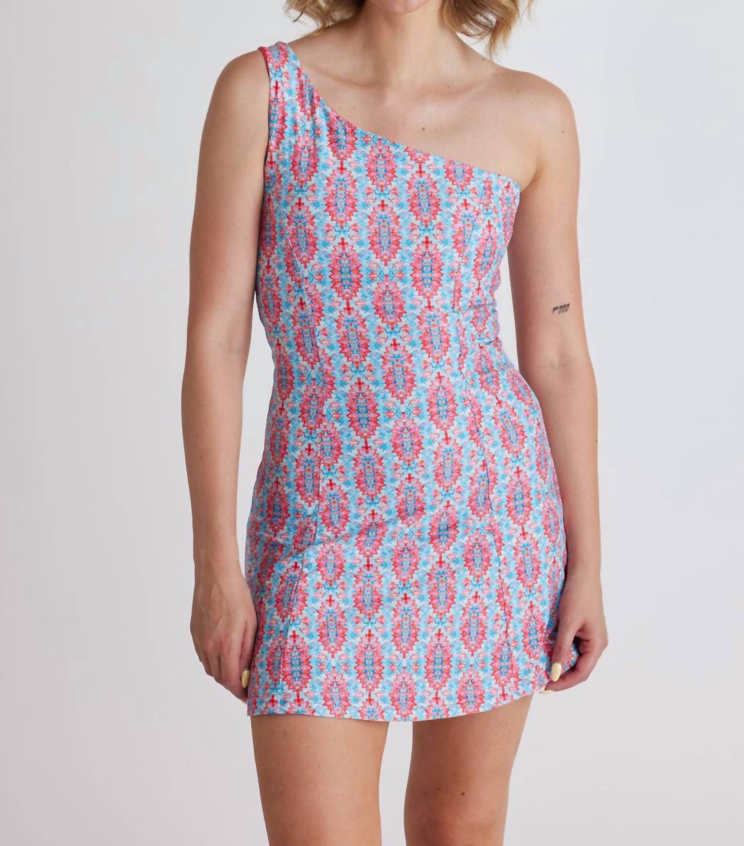 The kind of easy and flattering dress you'll be reaching for all season long. Introducing the Amalfi One Shoulder Mini Dress by WOLVEN, a statement piece for any occasion. This sleeveless dress, featuring an asymmetrical neckline and a bodycon silhouette, is crafted from recycled bottles, merging sustainability with style. Boasting a vibrant Amalfi print of bright coral and cool turquoise, it's designed for both function and flair with an ultra-soft, breathable, quick-drying, and odor-resistant fabric. Closure: Pull on. Care: Machine wash and line dry. Claudia wears size small. Ideal for game day or evening outings, this dress ensures you are dressed to impress.