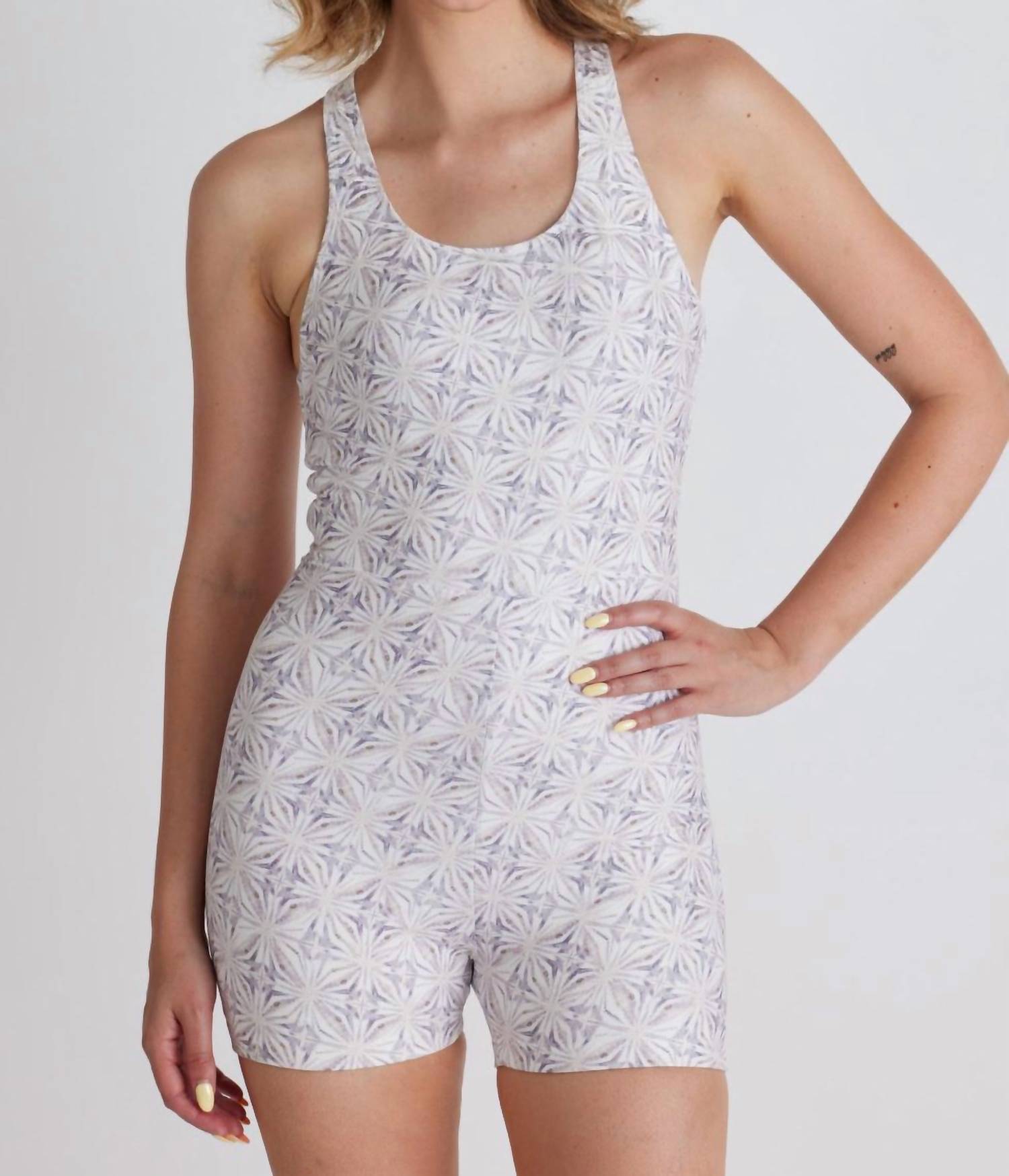 The perfect outfit choice when you you need something quick to throw on and still want to look efforlessly cool. Elevate your workout wardrobe with the Harmony Active Onesie by WOLVEN, a sustainable choice for those who value style and eco-consciousness. This white, patterned design features a cropped short length with thin straps and a cross-back design for a form-flattering fit. Made from recycled materials equivalent to 53.79 bottles, it offers a slim fit with a pull-on closure, ensuring quick-drying, breathable comfort with four-way stretch and odor resistance. Perfect for summer athleisure, this versatile onesie works effortlessly for fitness or casual outings; machine wash and line dry for best care.