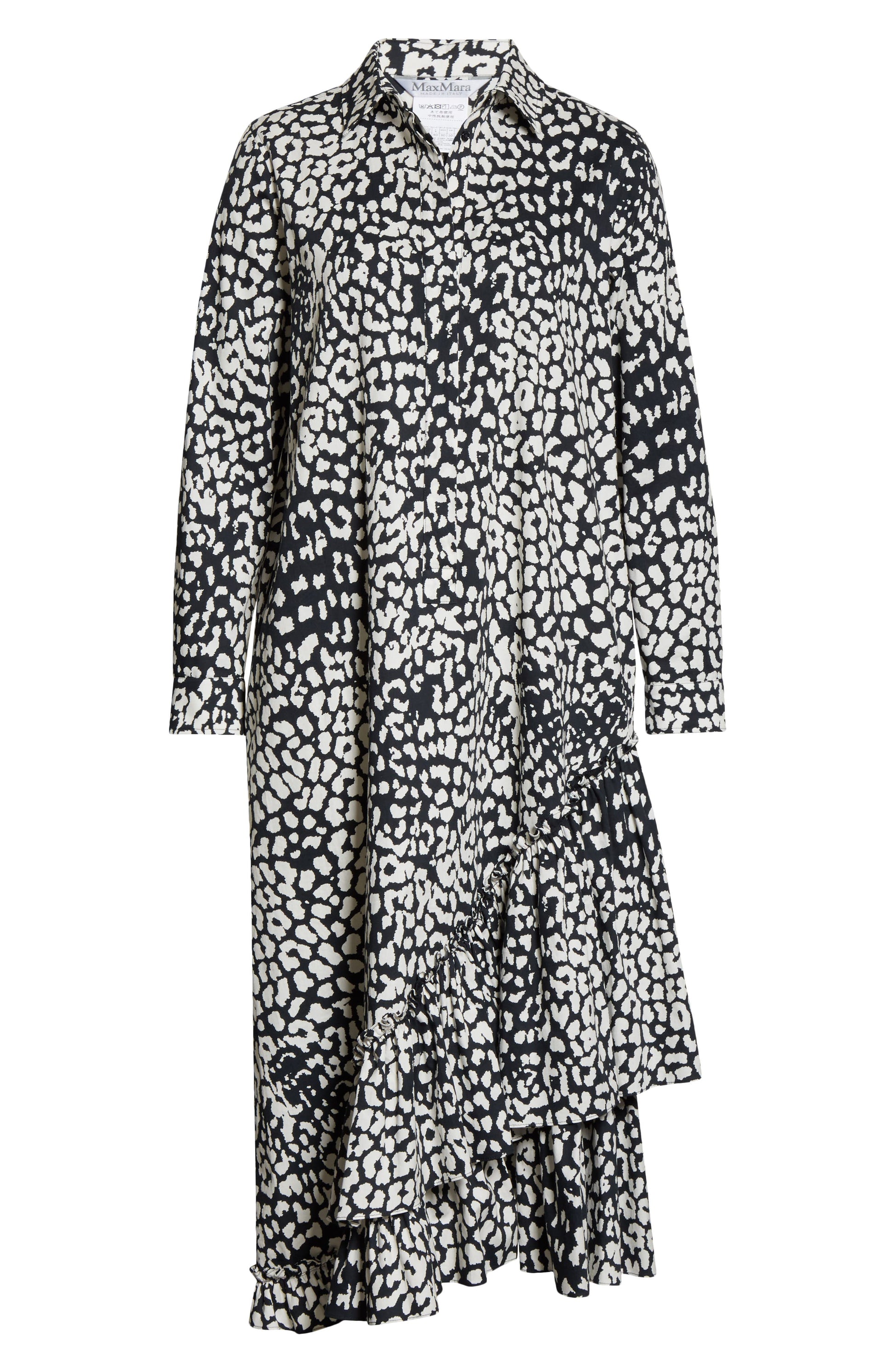 Discover the Max Mara Lipari Leopard Print Long Sleeve Cotton Midi Shirtdress, a stunning creation by designer Ian Griffiths. This dress exemplifies a 'sassy rather than romantic' style, featuring a playful tiered hem that flounces with every step.