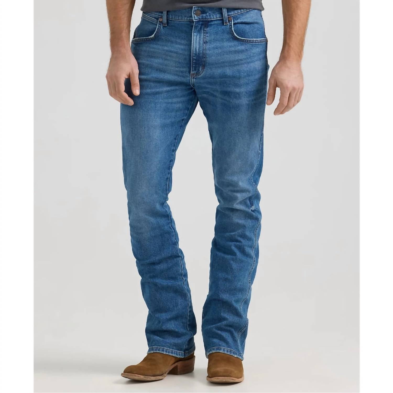 Embrace Western heritage with the Wrangler Retro Slim Boot Cut Jean, a classic staple reimagined for contemporary style. These men's jeans are crafted from durable cotton and feature a comfortable low rise with a slim fit through the seat, thigh, and knee, widening into a bootcut leg perfect for stylish wear. Closure: Button closure with a zip-fly. Care: Machine wash, tumble dry.