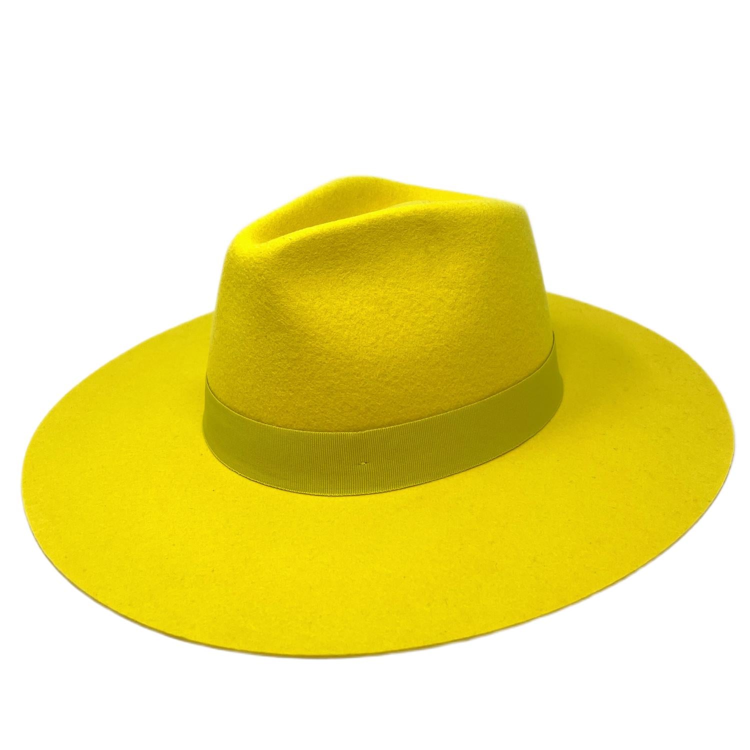 Meet the Penny Hat by WYETH, your ultimate statement piece for the Spring and Summer seasons. Highlighting a classic fedora style, it features a wide, stiff-cut brim that is complemented by a vibrant yellow grosgrain trim. Ideal for adding a pop of color to both vibrant ensembles and simple jeans paired with a white tee. Perfect for those who want to stand out with effortless elegance.