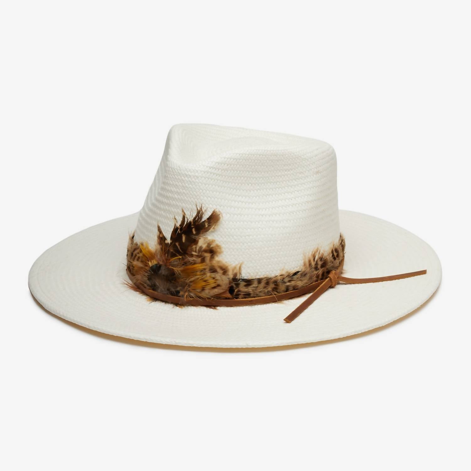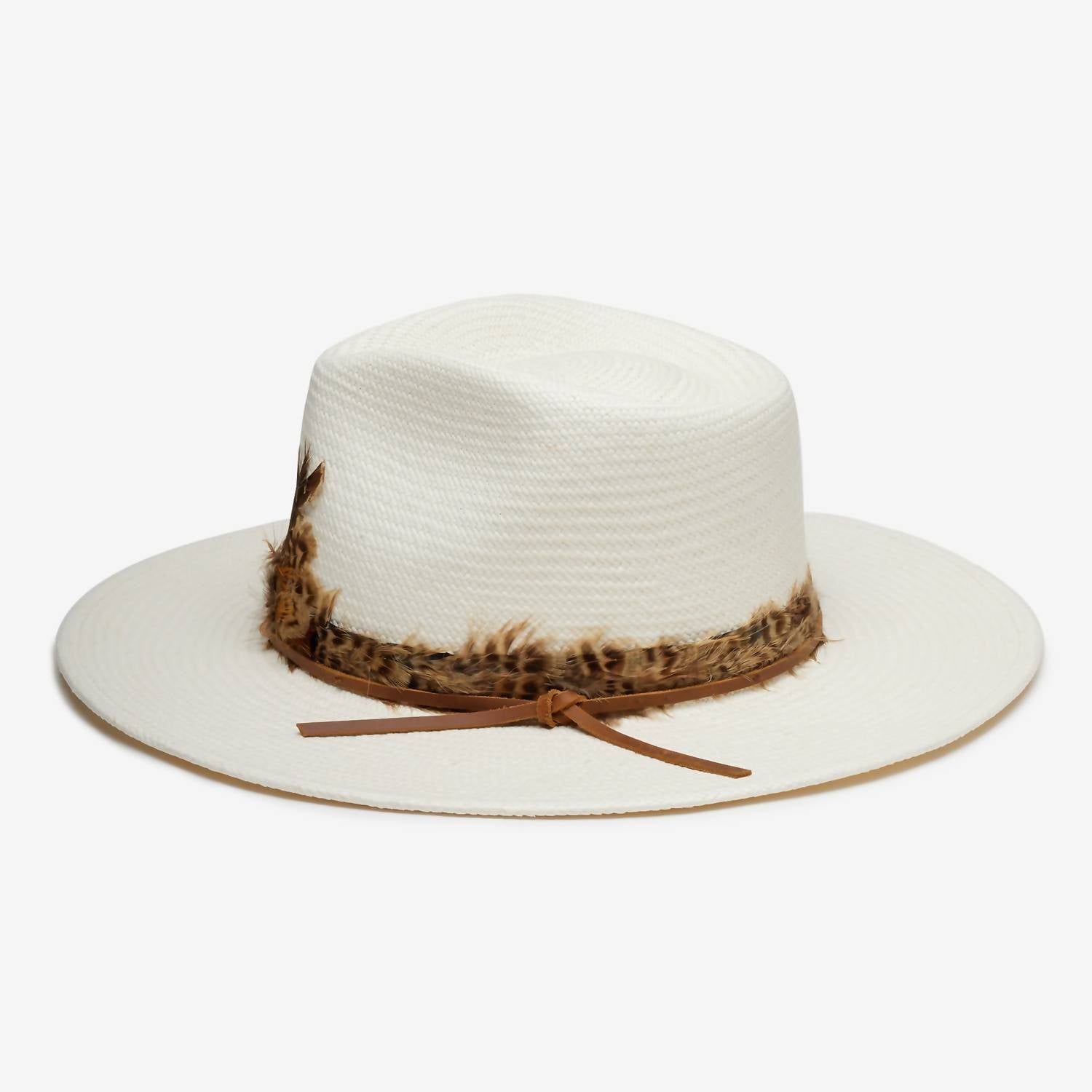 Block the sun in style with this adorable hat that will complement any outfit. Expertly crafted to elevate your style while providing a delightful touch of personality. Elevate your hat collection with the Raisa Ecuadorian Panama Straw Hat by WYETH, meticulously hand-woven from genuine Ecuadorian straw. This elegant accessory in a refined ivory shade is accentuated with a chic leather rope and feather trim. Ideal for a touch of sophistication to any outfit. Please handle with care for its longevity and timeless appeal.
