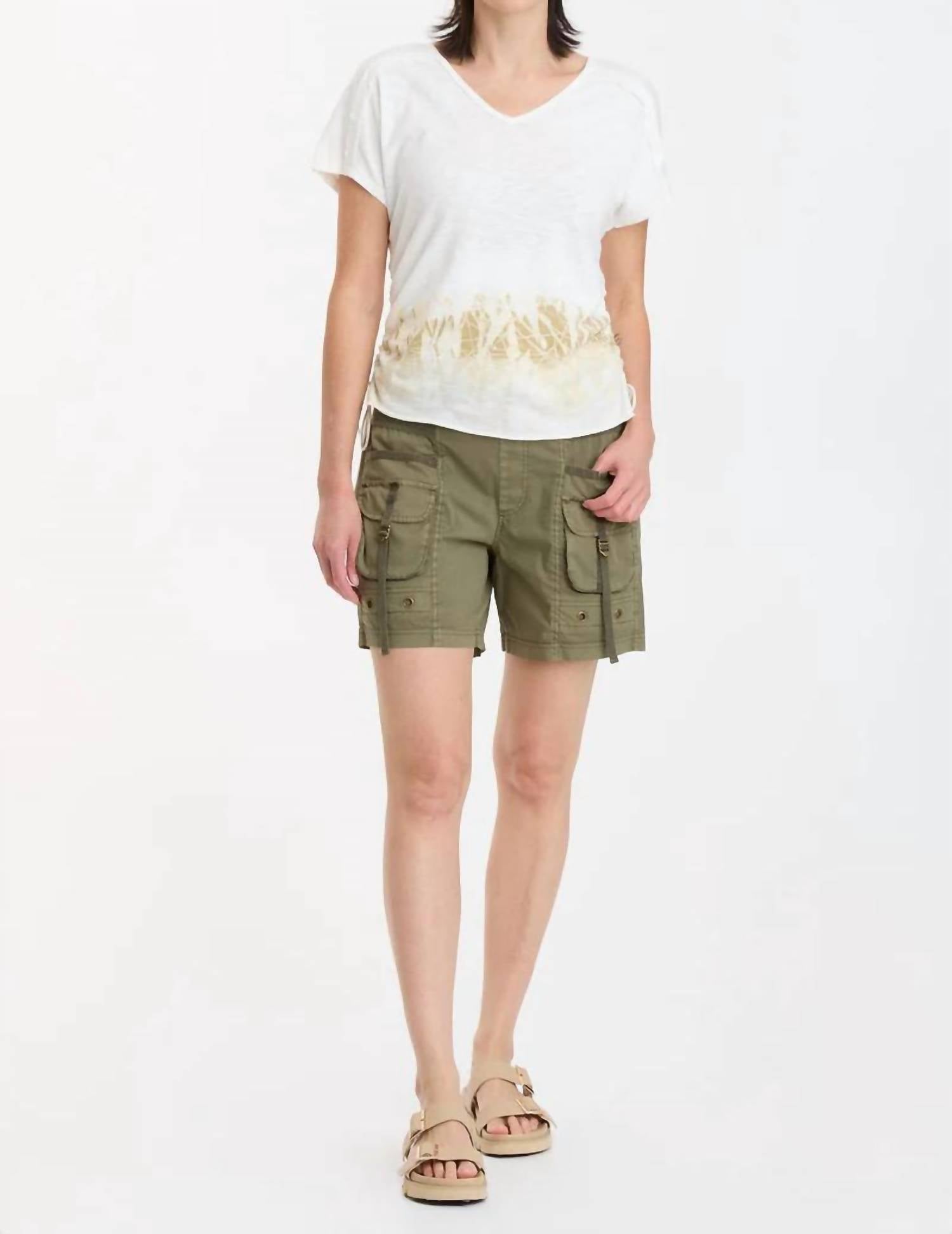 High-waist is here to stay and we especially love this style short. Perfect blend of comfort and style in leafy green. Pull-on short features a drawstring waistband and handy cargo pockets, ensuring both function and fashion. Crafted from Brio Poplin with a 97% Cotton and 3% Spandex blend and accented with a 2x1 rib waistband contrast. Offer a comfortable fit. With an inseam of approximately 6 inches. Peshrunk shorts are made for ease, just throw them in the machine to wash.