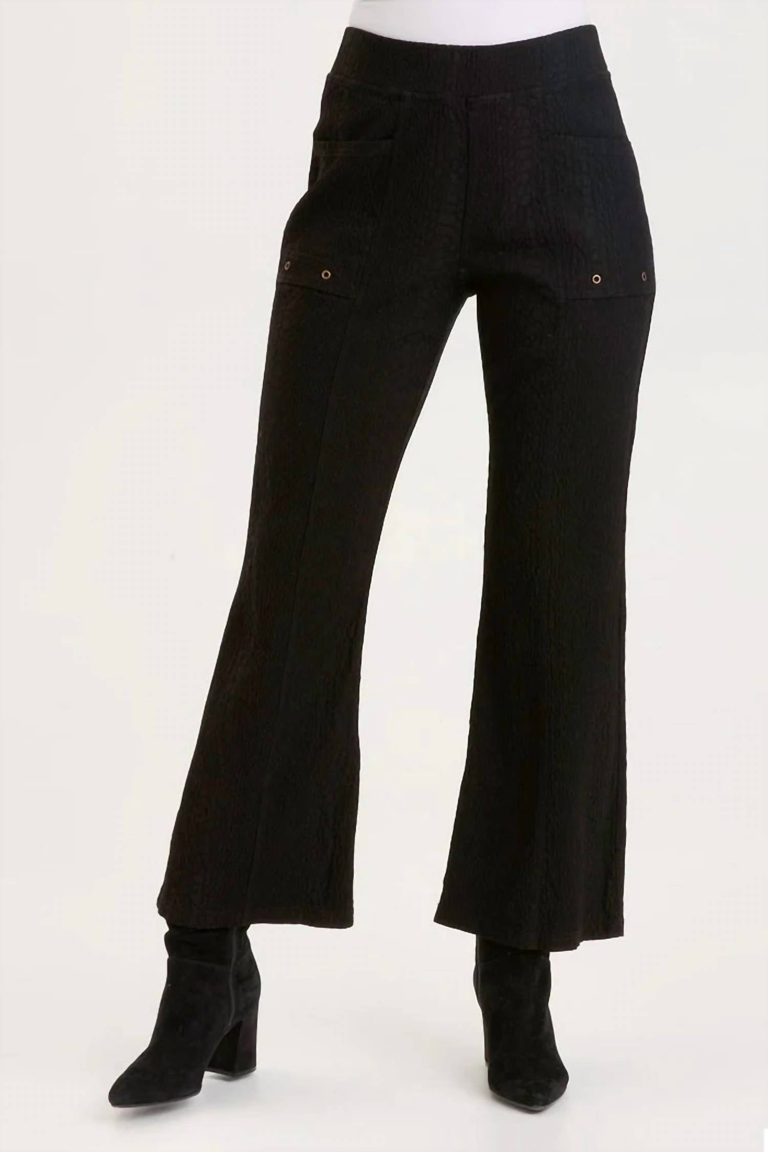 Stay on trend with these stylish boot cut pants that are fit to perfection. The perfect combination of comfort and fashion, you'll be grabbing for these all season long! Elevate your wardrobe with the XCVI Jenika Flare Pant, designed to offer both comfort and style. These pants feature a classic flared leg and a pull-on elastic waistband for ease of wear. Crafted from 60% Rayon, 35% Nylon, and 5% Spandex, the garment boasts an inseam of approximately 29 inches. Imported and machine washable, this piece showcases a timeless midnight black hue and convenient front and back pockets.