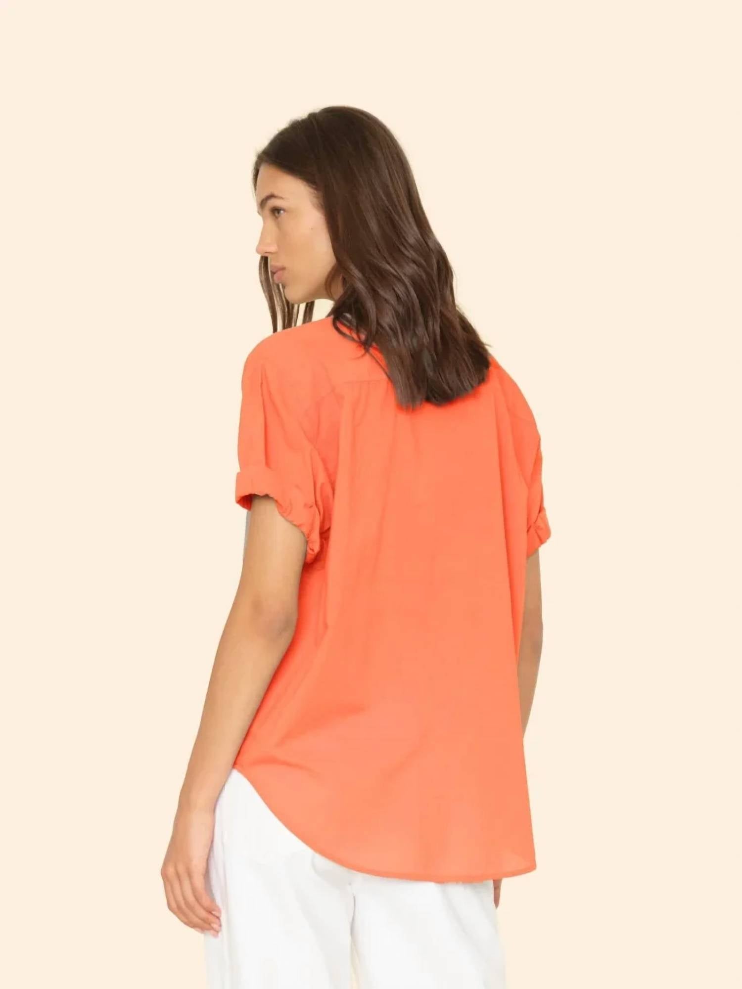 This button down shirt is comfortable yet polished. The Channing Shirt by XIRENA is a must-have for effortless, casual style at your next music festival. Designed in a vibrant Sugar Poppy orange, this short sleeve shirt features rolled cuffs for a relaxed, live-in look. Made from 100% cotton poplin, it's lightweight and breathable with a small pointed collar and front button closure. It is crafted in the US and is easy to care for with a simple machine wash and tumble dry.