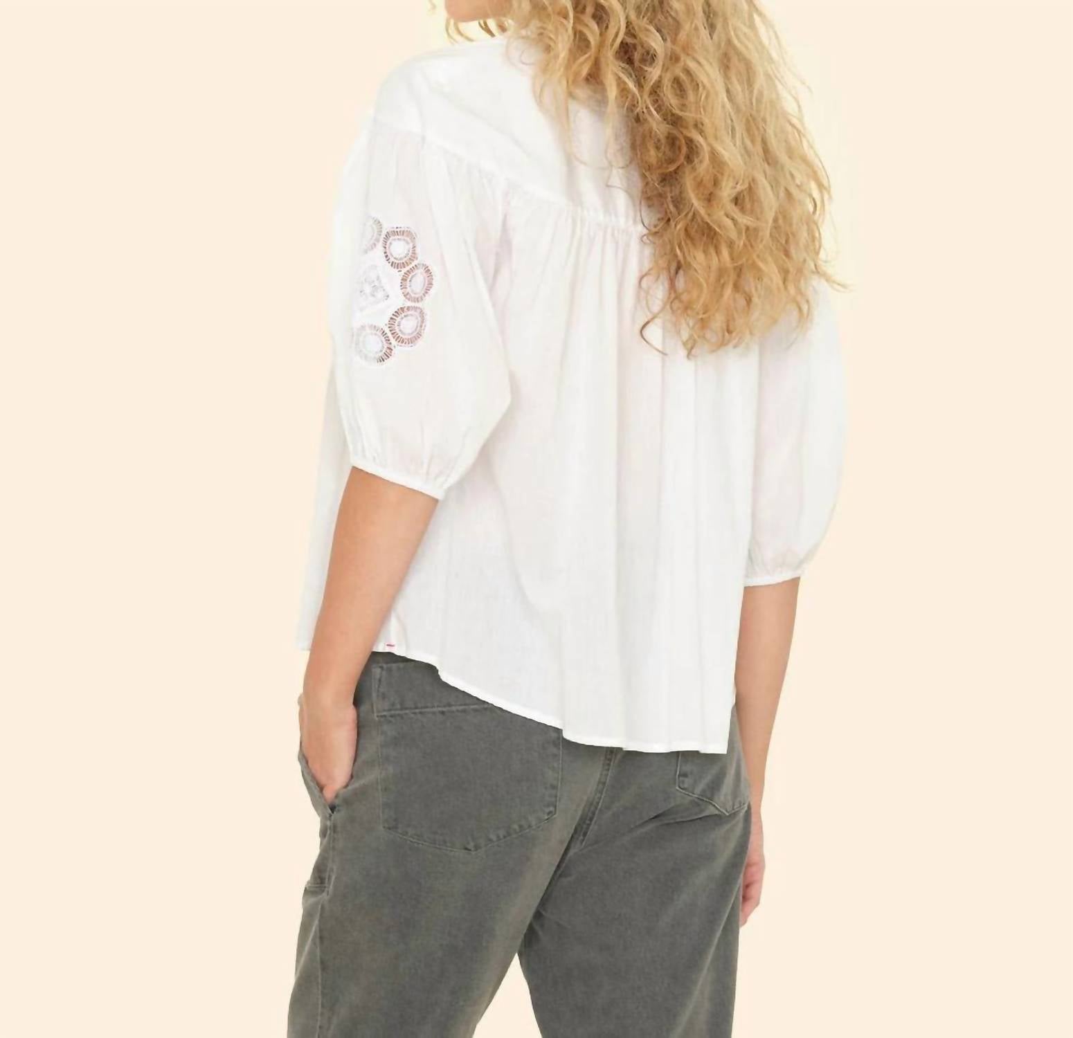 Introducing the Kenza Top by XIRENA, an elegant addition to your wardrobe crafted in superfine Calista fine cotton voile for a soft touch. This white blouse is designed with feminine elbow puff sleeves featuring floral broderie anglaise and a hidden button-front closure. Composition: 100% Cotton. Care: Machine wash cold on gentle cycle, hang to dry. Model is 5'10" and wears size Small.